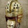 The entire interior of the helm and the inside of the hinged plates are lined with stitched leather. An internal and adjustable leather suspension liner is integrated into the helmet. Two small brass rings on the cheekplates serve as anchor points for the included leather cord chinstrap.