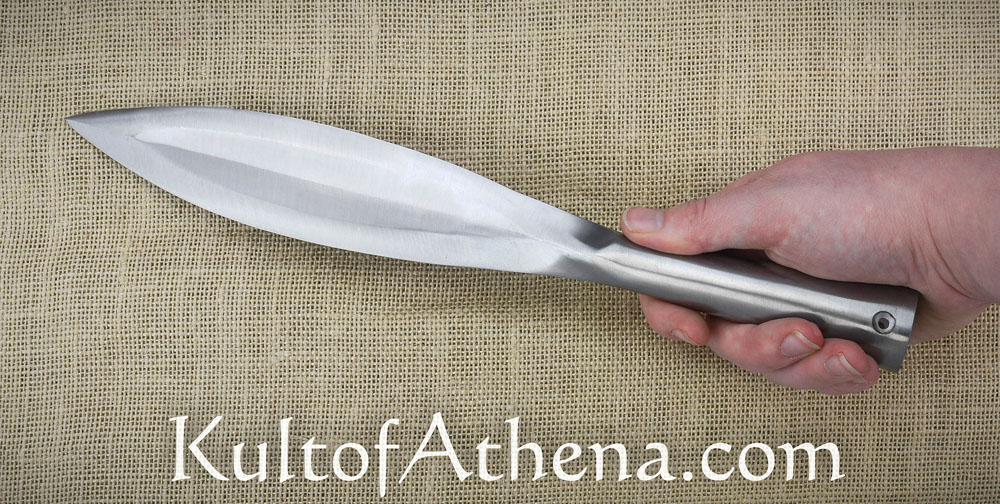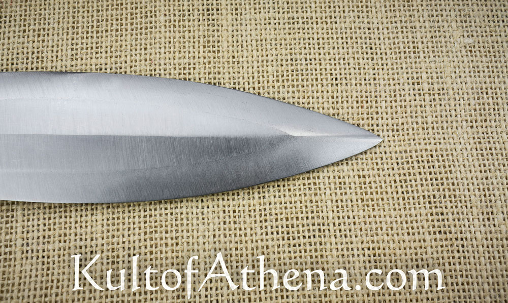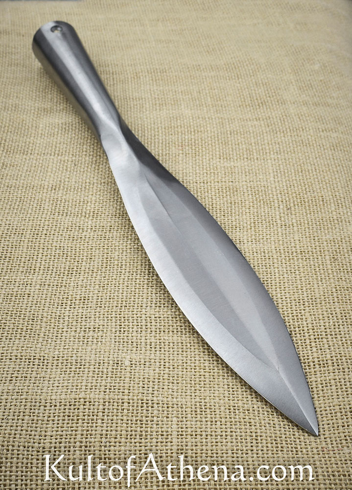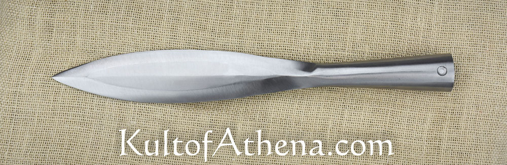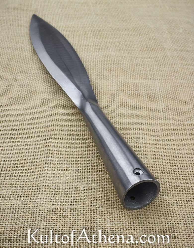This Leaf shaped spearhead is crafted from high carbon steel and its socketable form is ready to be fitted onto your own spear haft with a tapered end. Two pre-drilled holes will accommodate your own screws or pins to further secure the spearhead atop your pole. The socket opening is approximately 1 1/16 in diameter – 27 mm