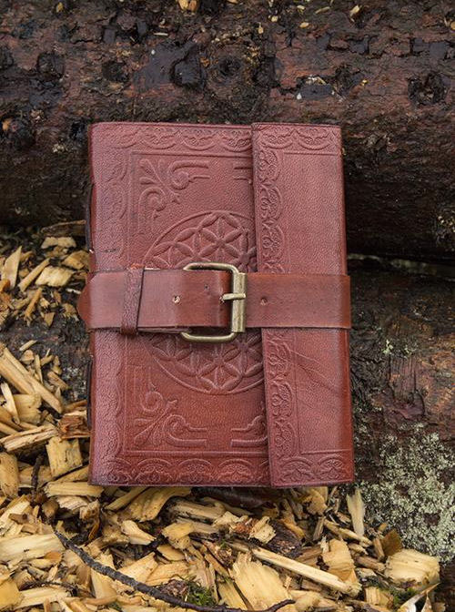 The journal binding is made from thick and supple top grain leather. Bound with leather cord to the spine are approximately 200 pages of characterfully textured paper. A leather strap with a matched antiqued brass buckle secure it closed.