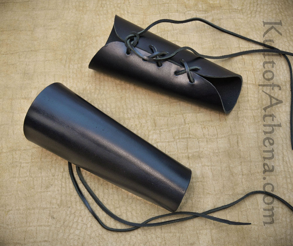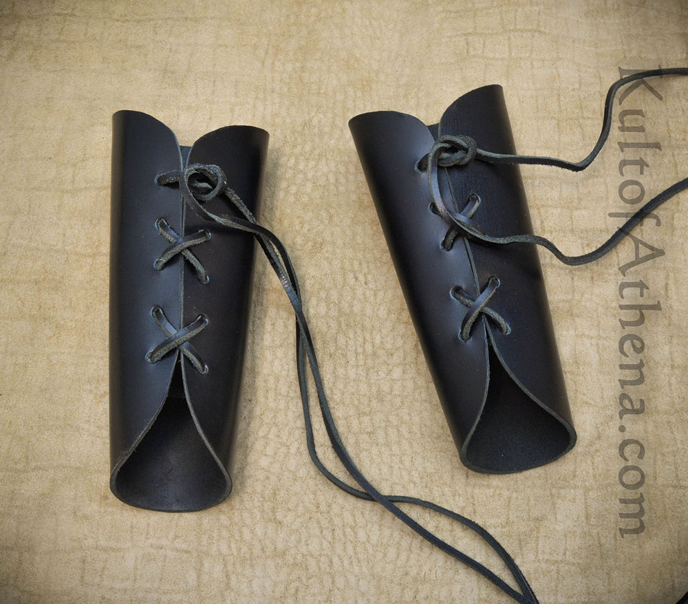 These basic leather bracers are crafted from thick, quality 7-8 oz leather; they are bound to the arms with a thick leather lacing cord and can be adjusted to fit a wide variety of forearm sizes.
