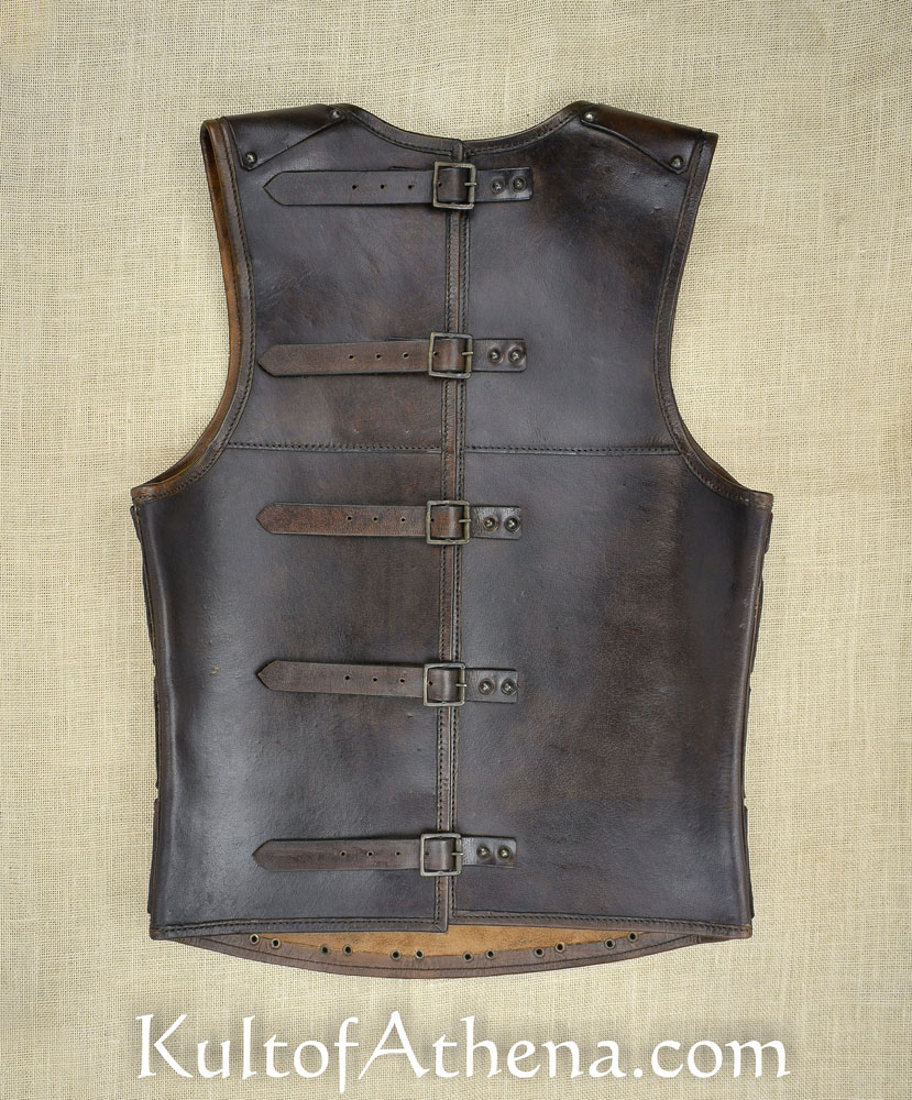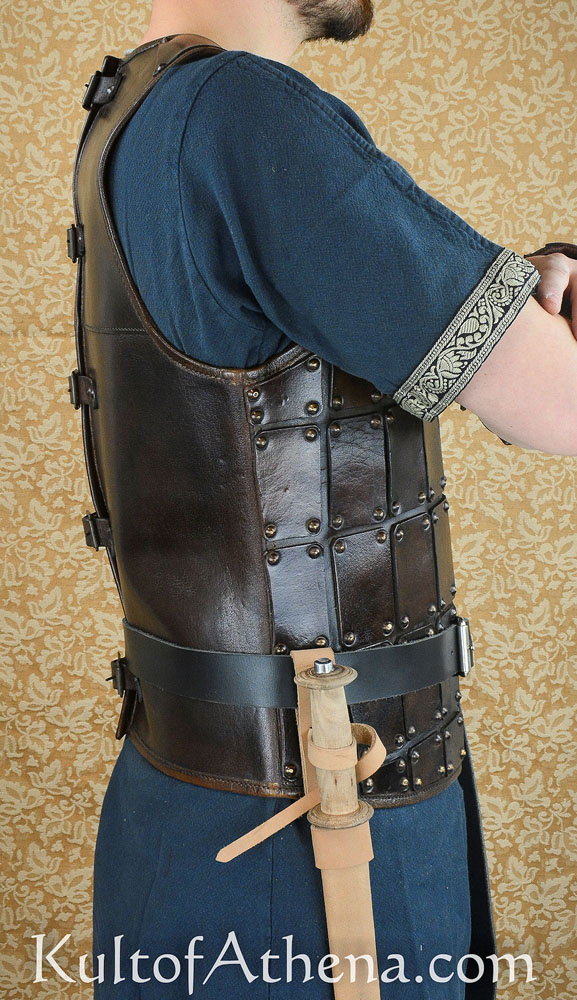 This leather Brigandine is a cuirass of leather which is robustly riveted with thick leather plates. Constructed from high quality and well-dyed vegetable-tanned leather, the Brigandine is donned and adjusted to fit with a set of antiqued brass buckles with matching leather straps on its back. The rivets are fashioned from antiqued brass.