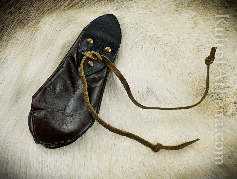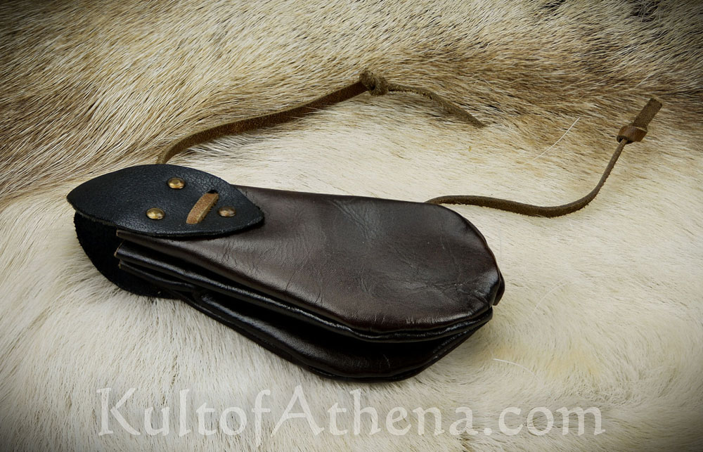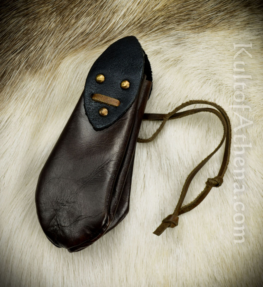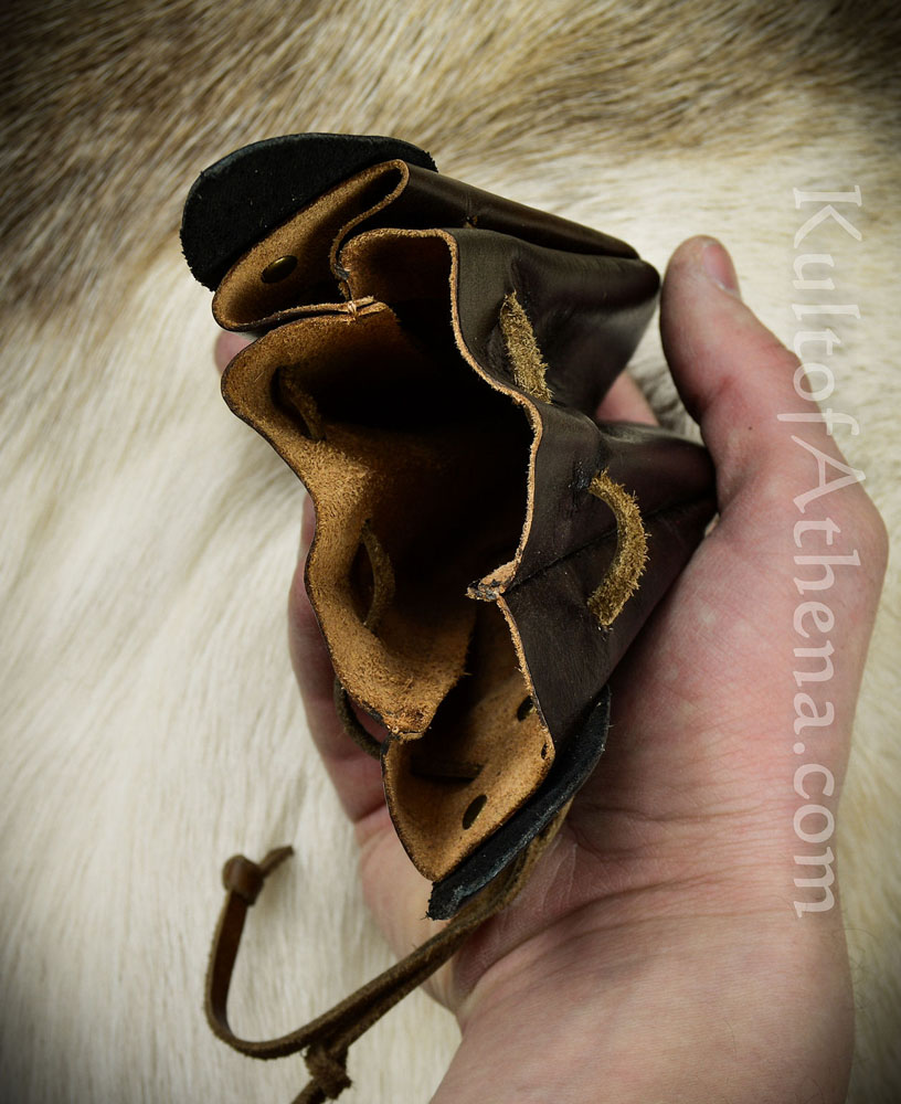 This Coin Purse is crafted from dark brown leather with tabs of black leather fitted into place with brass studs. Its accordion-like form is drawn closed with an interlaced leather drawstring.