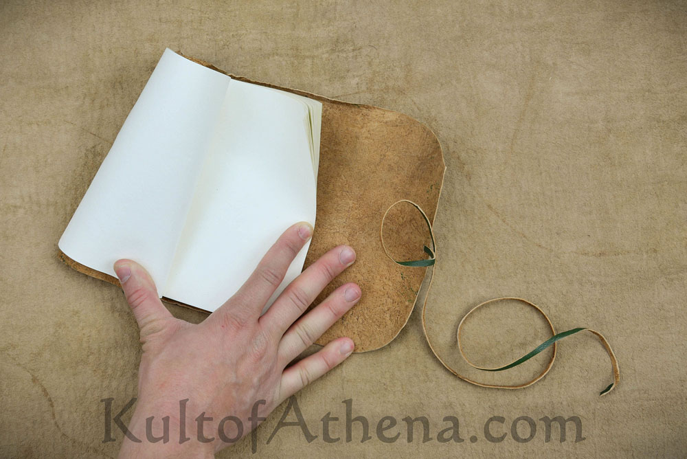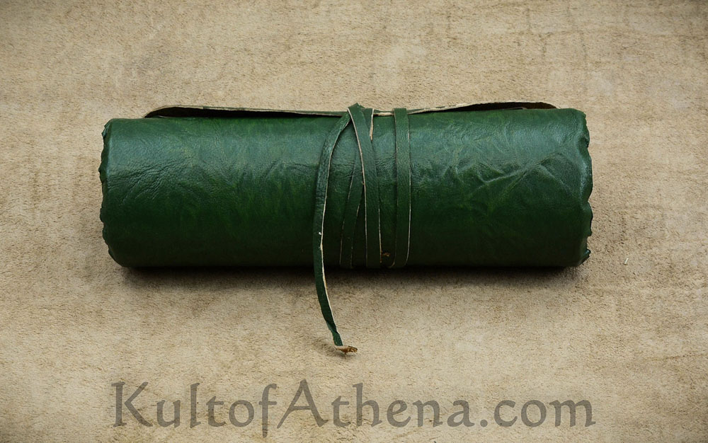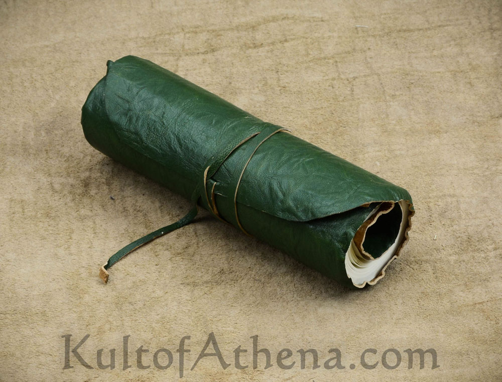 This crush diary is rolled up for easy transport; ideal for the journeyman or wayward adventurer. It can be unfurled to allow for notes to be written within. The blank, textured paper is bound within a cover of green leather.