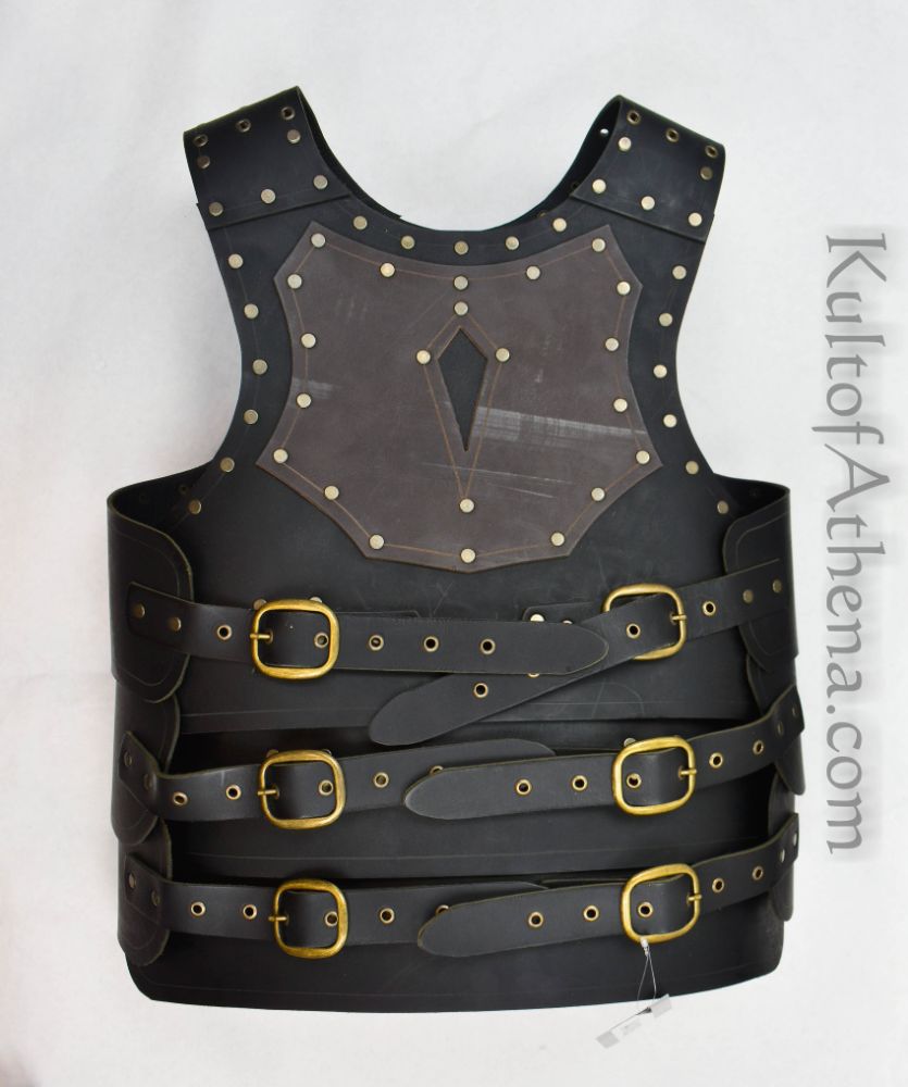 This Mercenary Leather Torso Armor is constructed from thick 8-9 oz (4 mm) thick leather which is sturdily riveted together with antiqued brass rivets. It can be adjusted to size with its set of antiqued brass buckles on the back. Brass eyelets at the shoulders allow for additional pauldrons (not included) to be laced onto the armor.