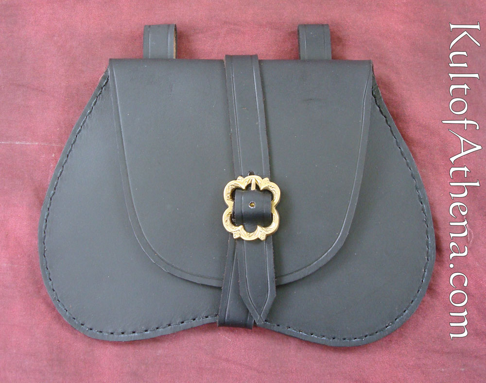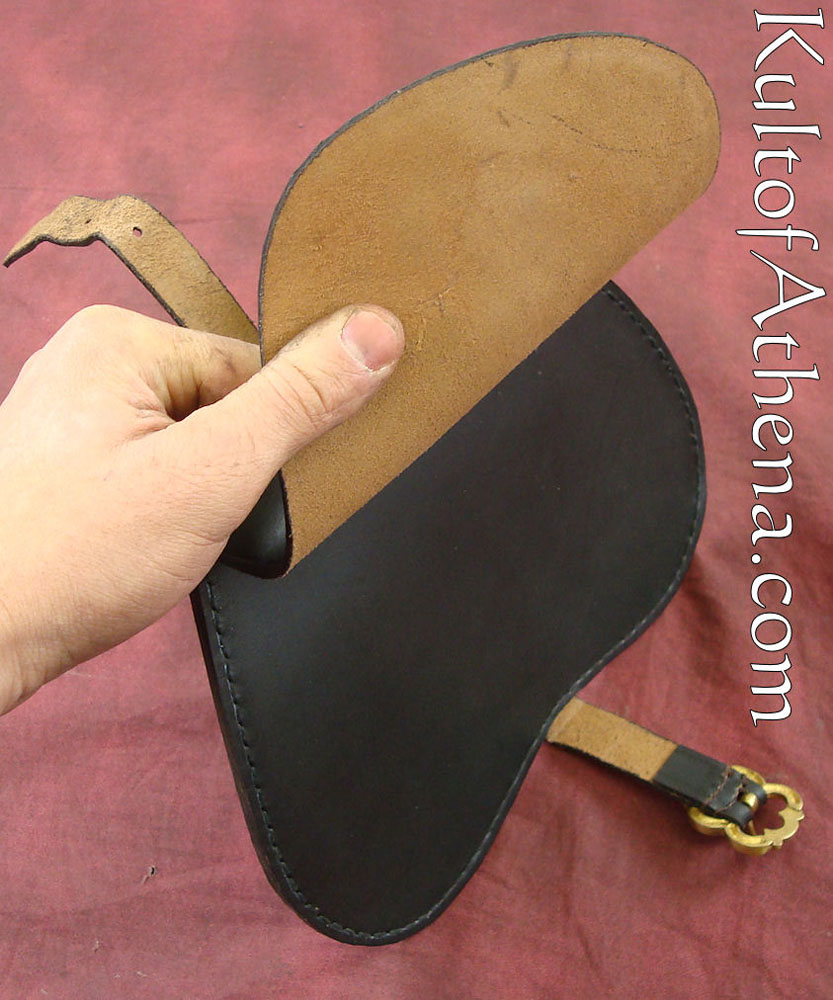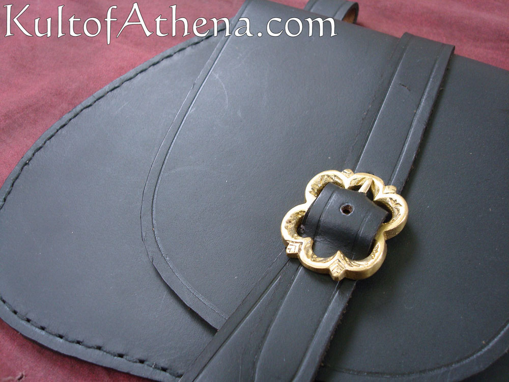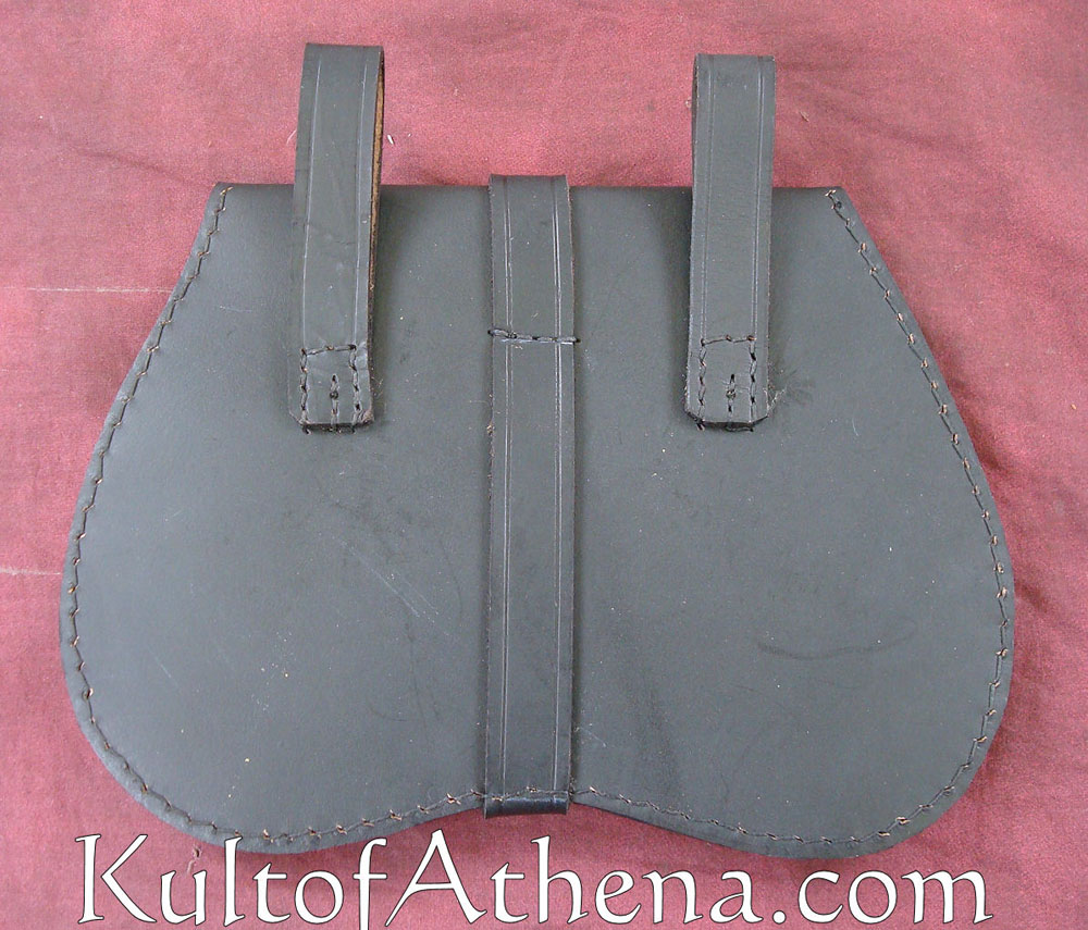 This thin Medieval or Renaissance leather pouch is crafted from hard, stitched thick leather. It has integrated belt loops and is held closed with an overlaying strap and buckle. Good for carrying thinner goods on your person in a durable pouch.