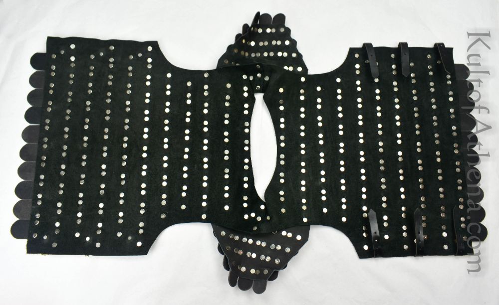 This Leather Scale Armor Cuirass is composed of rounded scales of thick 7-8 oz leather which are sturdily riveted to a backing of black leather. These scales are quite thick and will provide good concussive protection for some combat sports and LARP. Both sides of the armor have a series of antiqued brass buckles and leather straps that can be used to widely adjust and fine-tune the fit of the armor to your torso.