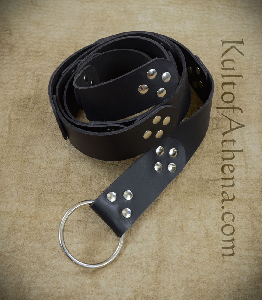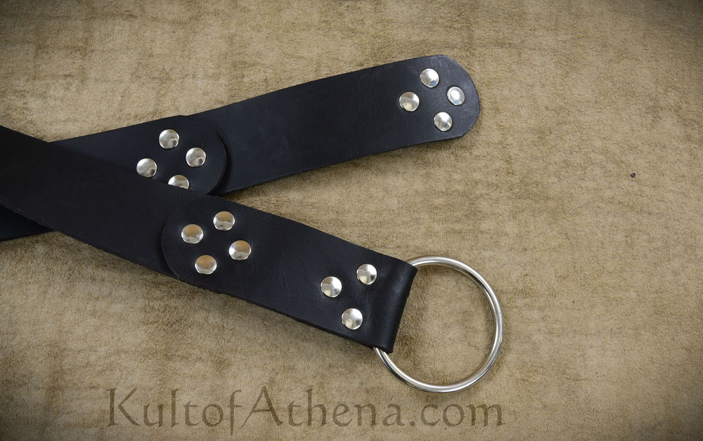 This ring belt is crafted from segmented leather plates and steel rivets. The ring buckle is of steel.