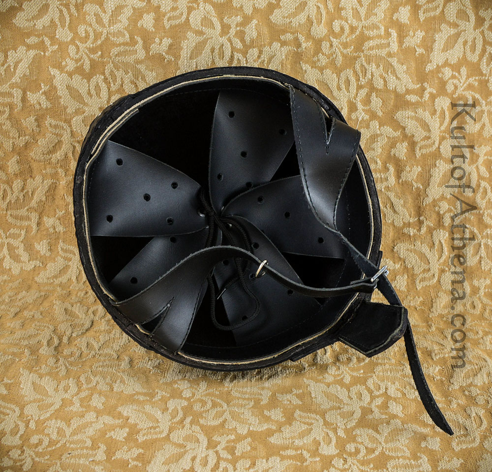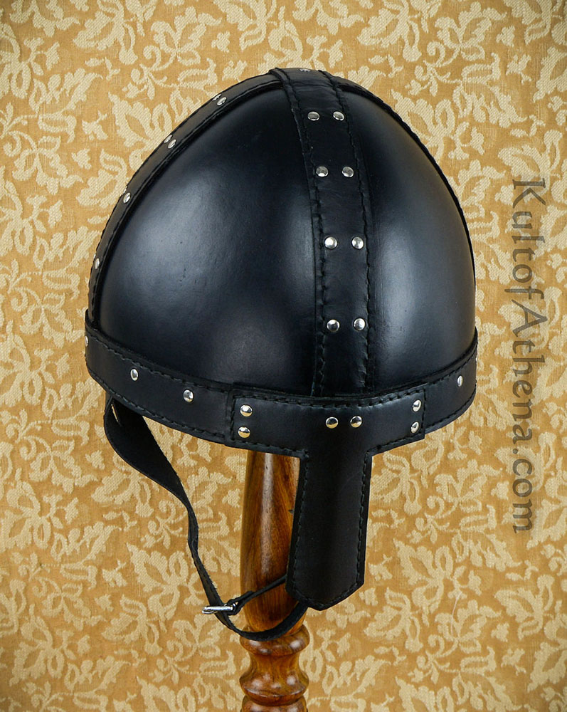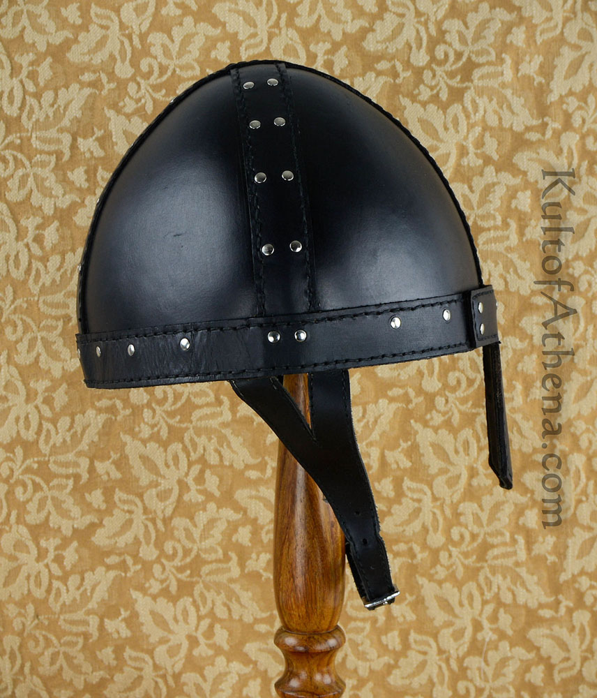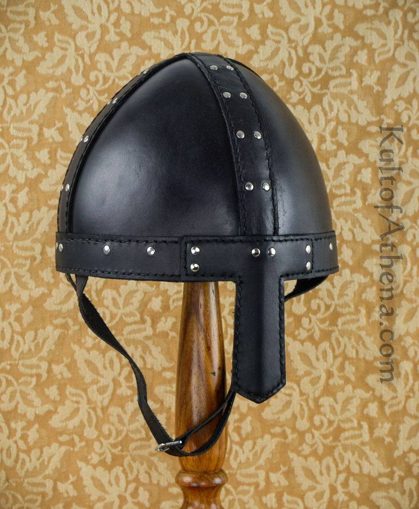 This Spangenhelm is crafted from thick and sturdy 12-13 oz leather with stitched and steel-riveted construction. It is a great way to have the look of a Viking, Norman Knight or Crusader without the weight a steel helmet brings to a long day.