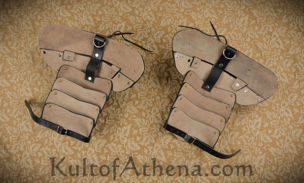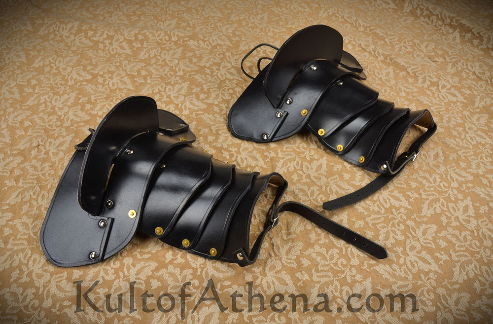 This pair of leather pauldrons is crafted from robust leather that is 9-11 oz in thickness. It is sturdily constructed with rivets of brass and steel. It has both a cord and a steel D-ring and these can be used to attach the pauldrons to a gorget or cuirass for support. A thick leather strap with an adjustable steel buckle affixes the leather armor to the arm and ensures that it moves in tandem with the arm.