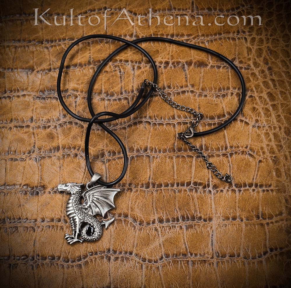 This pendant is of antiqued stainless steel and is coupled with a faux leather cord with a metal clasp and adjusting extension cord.