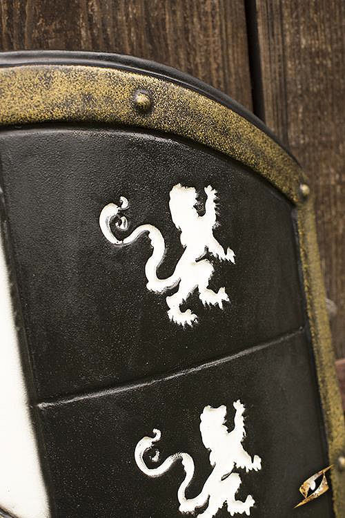 Epic Armourys Lion Shield is a semi-curved, kite-shield inspired by 10th to 12th century Normans. Finished with a beautifully detailed laser-cut heraldry pattern, this shield will fit perfectly in the hands of an infantryman or knight. The rest of the shield is handmade and painted, designed to look like a lacquered shield with a metal rim.