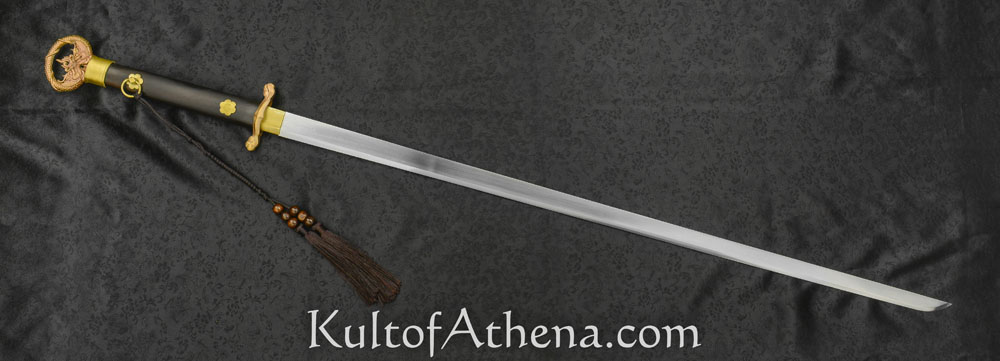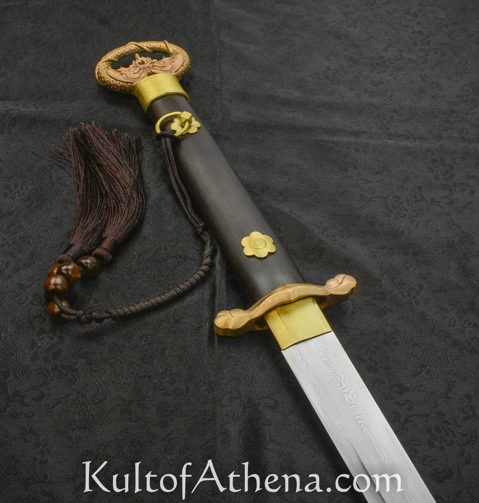 The blade of this straight-bladed Dao is stiff with a thickened spine; a design intended to give it considerable piercing power against the armor of the time. The skillful bladesmith forged the blade by melding and folding 1065 and T8 high carbon steel into a single blade; its tempered hardness is 58 HRc. The guard, pommel and blade collar are finely cast from brass and the grip is robust ebony wood.