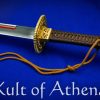 The hilt fittings are crafted in brass in the open metal work style in the Mongolian / Tibetan style popular to late Ming and early Qing Imperial Dao swords. The original was iron with silver and gold gilding while LK has opted for a solid, bright brass option here to give a golden appearance that highlights the high quality of the casting work and the details captured by the original engraver. The wooden grip is wrapped in braided brown cord to complete the sword. The sword is matched with a wood scabbard which is overlaid in faux leather and completed with immaculately detailed cast brass fittings to match the hilt. A cloth sword bag for storage and transport is included.