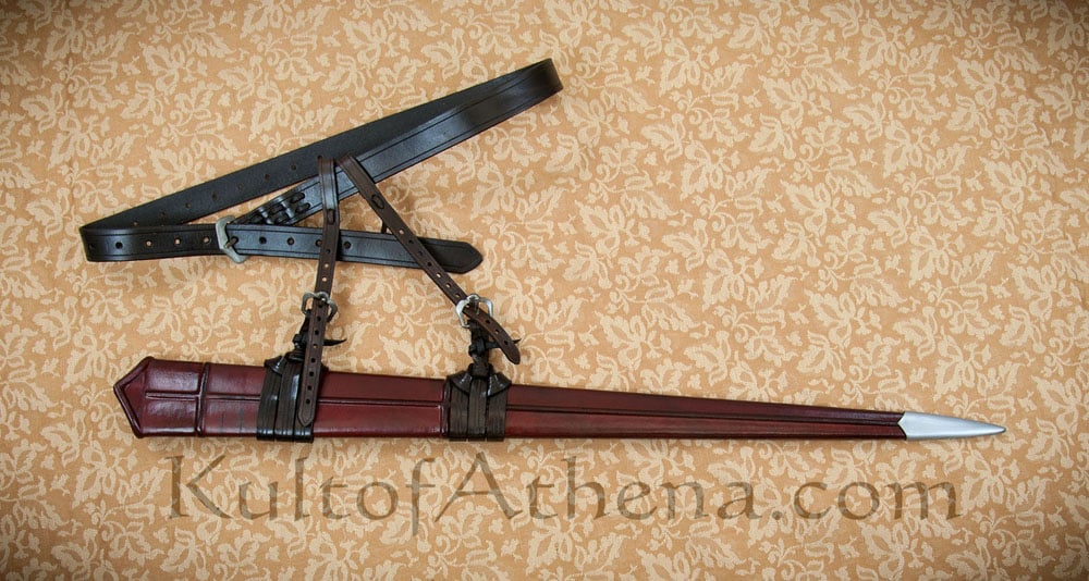 The scabbard is overlaid with a tightly fitted and stitched outer layer of dyed leather. It is finished with a protective steel chape and a pair of knotted anchor points with antiqued metal buckles.