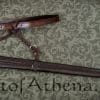 These finely crafted scabbards are wood-core scabbards with a form-fitted outer layer of dyed leather. A pair of buckled scabbard hangers are integrated and woven into the scabbard itself. The scabbard is finished with a protective metal chape.