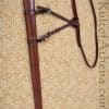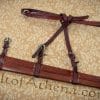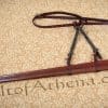 The sword belt is made from durable leather; it can both be adjusted to fit the waist and its sword hanger can be adjusted to control the distance and angle by which the scabbard fits in relation to the belt. It is intentional that the hanger has two straps but the scabbard has three buckled fitting points – your choice of which two to use control how far forward and at what angle you wish the scabbard to hang.
