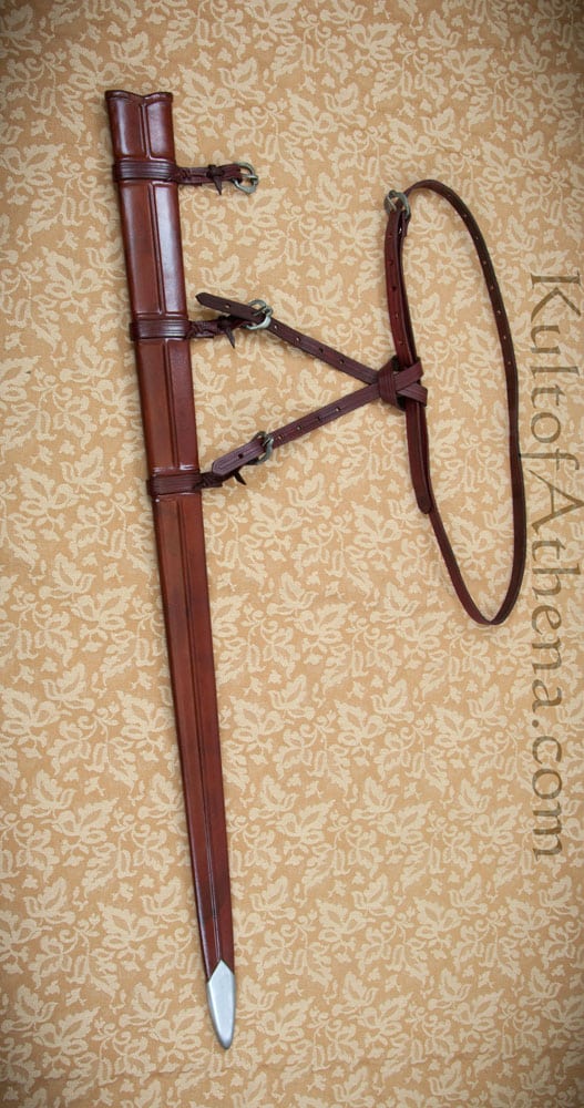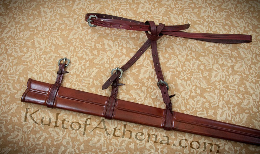 These scabbards are well-fitted wood-core scabbards encased within a protective skin of tightly fitted and stitched dyed leather. A trio of metal-buckled anchor points are integrated to the scabbard to allow it to be melded with the included sword belt. The tip of the scabbard is capped with a metal protective chape.