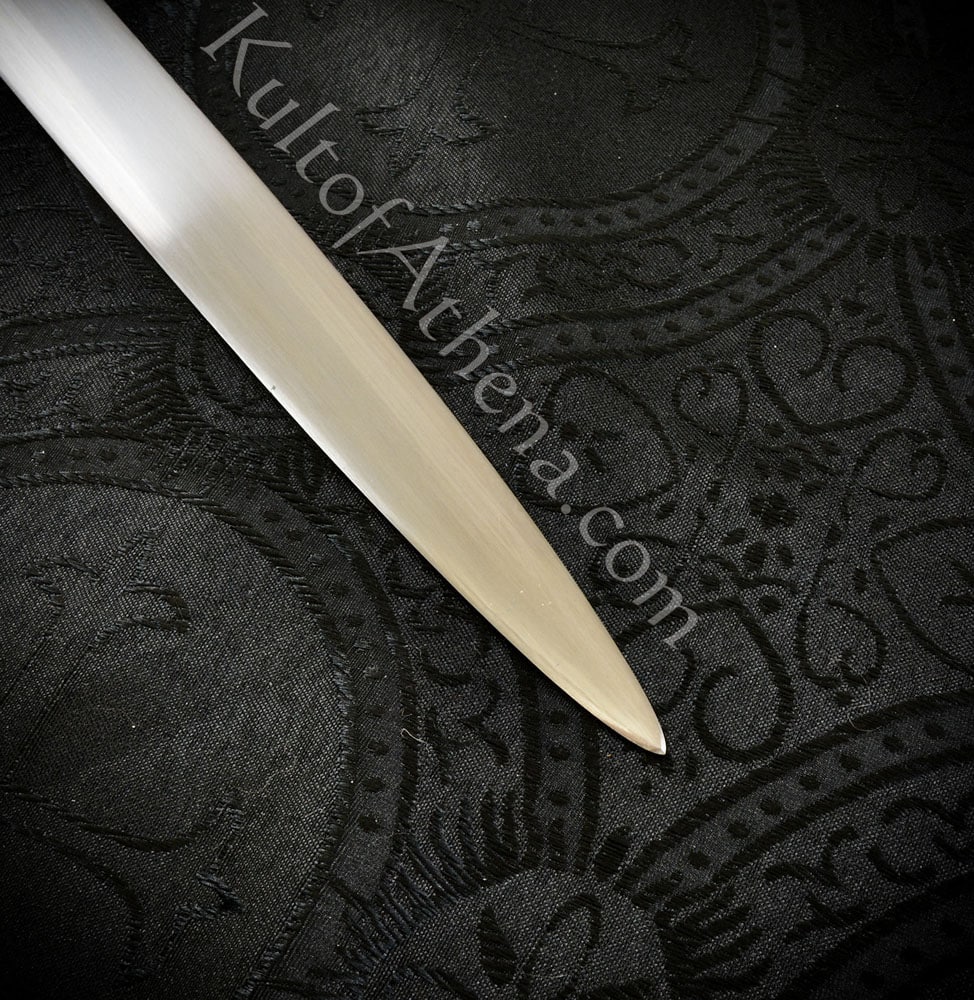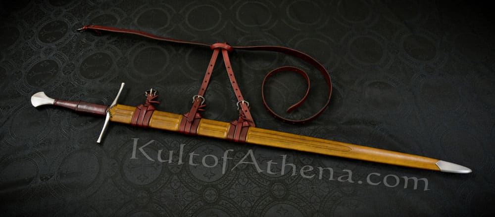 The companion scabbard to this sword has a core of carved wood with a skin of form-fitting leather. The chape is steel and the scabbard is finished with three metal hanging buckles integrated onto the scabbard with tightly knotted bands of leather. A sword belt of matching sturdy leather is included, as well as a sword hanger that can be knotted onto the belt and then buckled onto the scabbard onto any two of the three scabbard buckles of your choice.