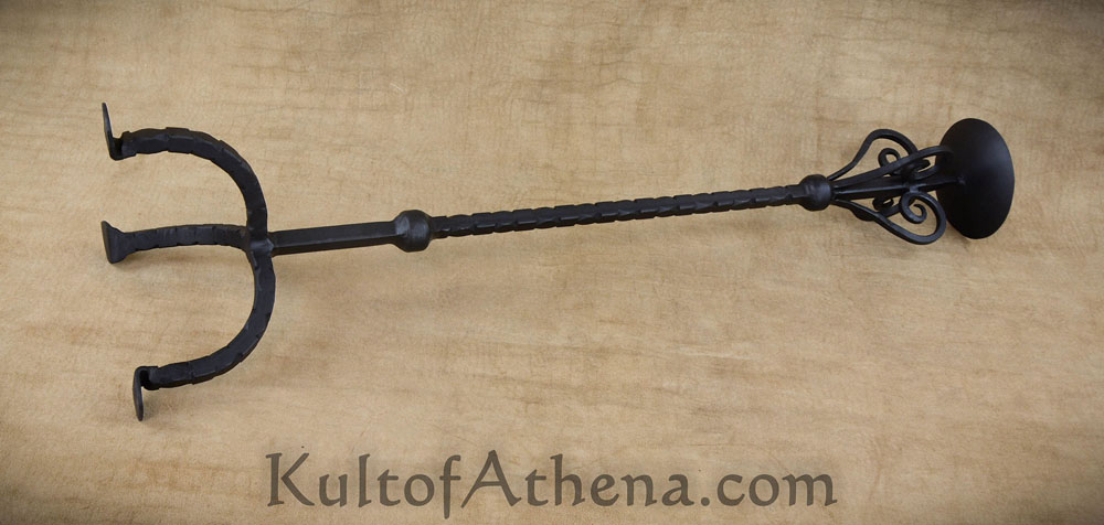 This Medieval candlestick of iron is ready to upgrade the ambience of your Medieval or Renaissance room or camp. It is stabilized upright with a tripod leg base arrangement.