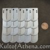 This pack of 20 armor scales are ready to be made into your own custom scale armor. Each scale is made from 22 gauge steel and are pre-perforated to allow you to tie or rivet them onto your own padded cloth or leather backing and form. Smaller holes allow for armor scales to be sewn together at their base as well.