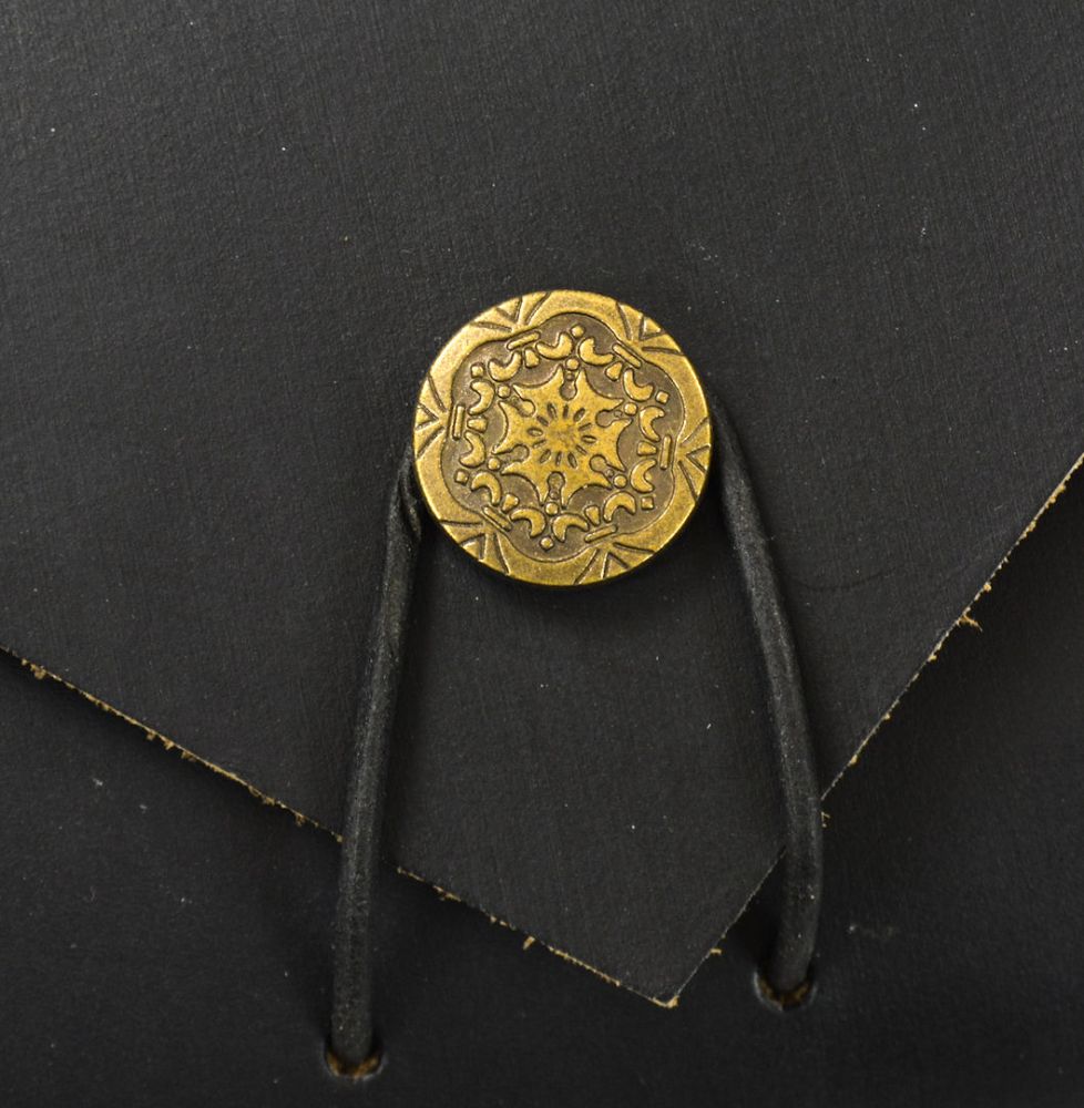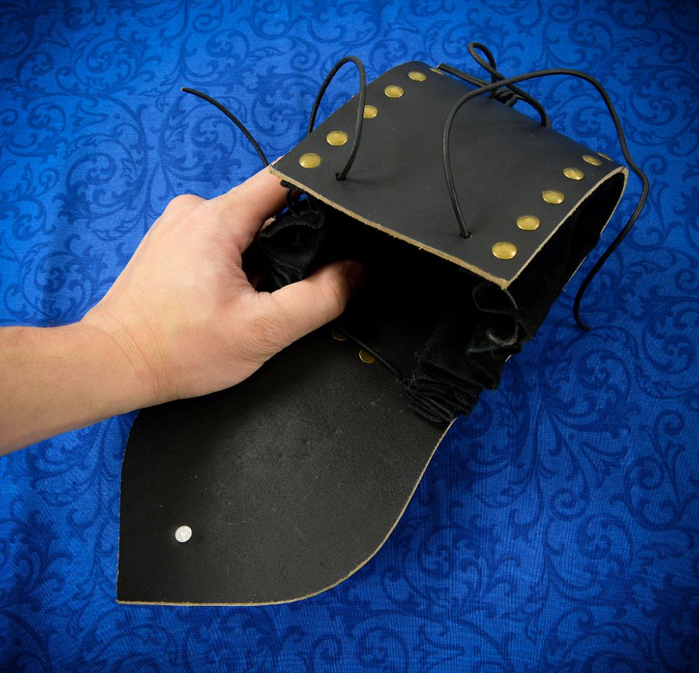 This leather pouch is made from suede  leather with a matching, riveted hard black leather shell and belt loop. The catch button is made from antiqued brass. Integrated leather laces allow the pouch to be tightened.