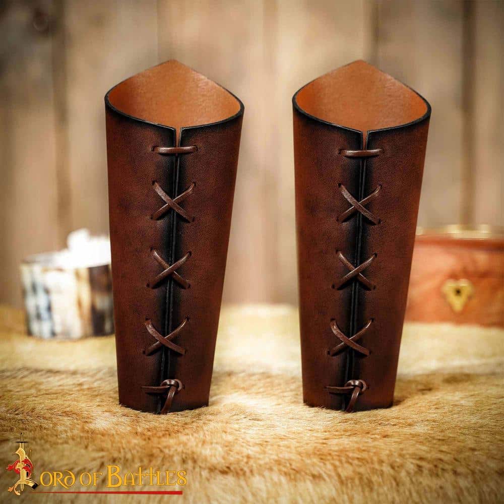 These bracers are artistically handcrafted from robust genuine buff leather. A set of genuine leather strings is provided for a highly adjustable fit.