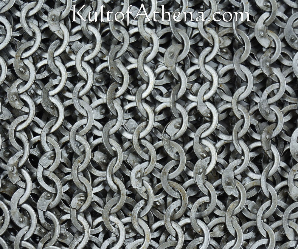 This set of sleeve and shoulder mail armor pieces are constructed from wedge-riveted flat links of mail which alternate with solid flat rings. The individual mild steel rings measure 17 gauge in thickness and are 9 mm in diameter. These mail panels and sleeves are intended to be sewn onto a padded gambeson to upgrade its defenses; particularly when the gameson is worn beneath plate armor to ensure that the gaps in the plate armor covered with mail protection.