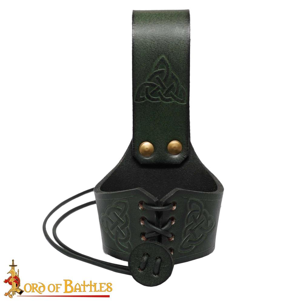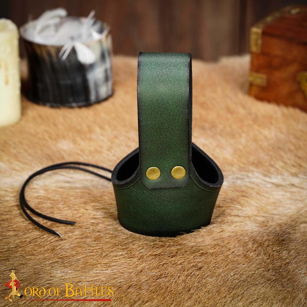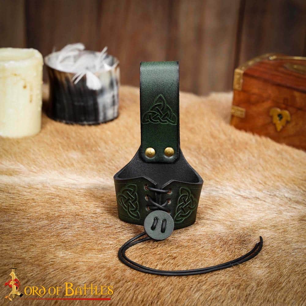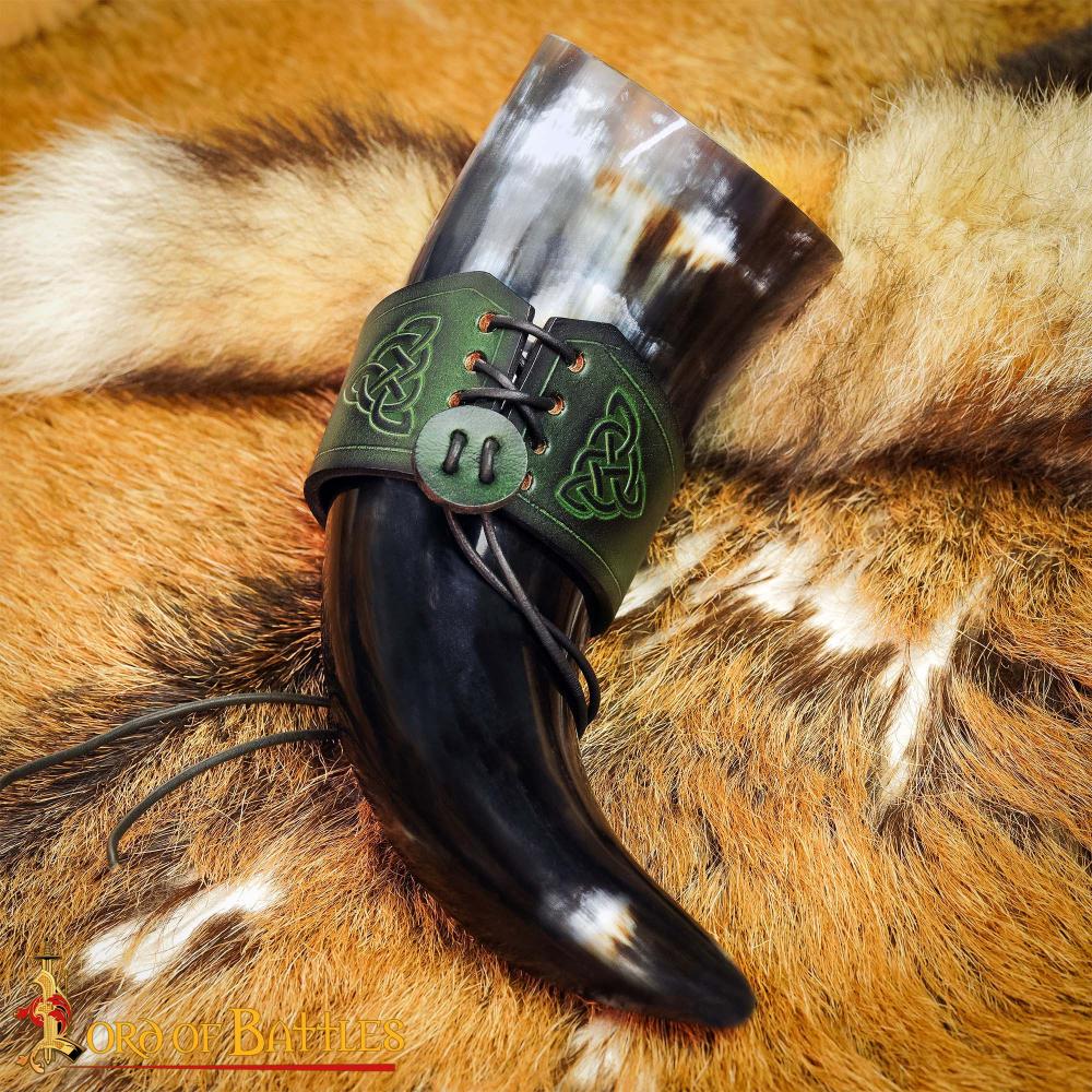 Green Leather Drinking Horn Holder with Embossed Design – Smaller Version – Lord of Battles