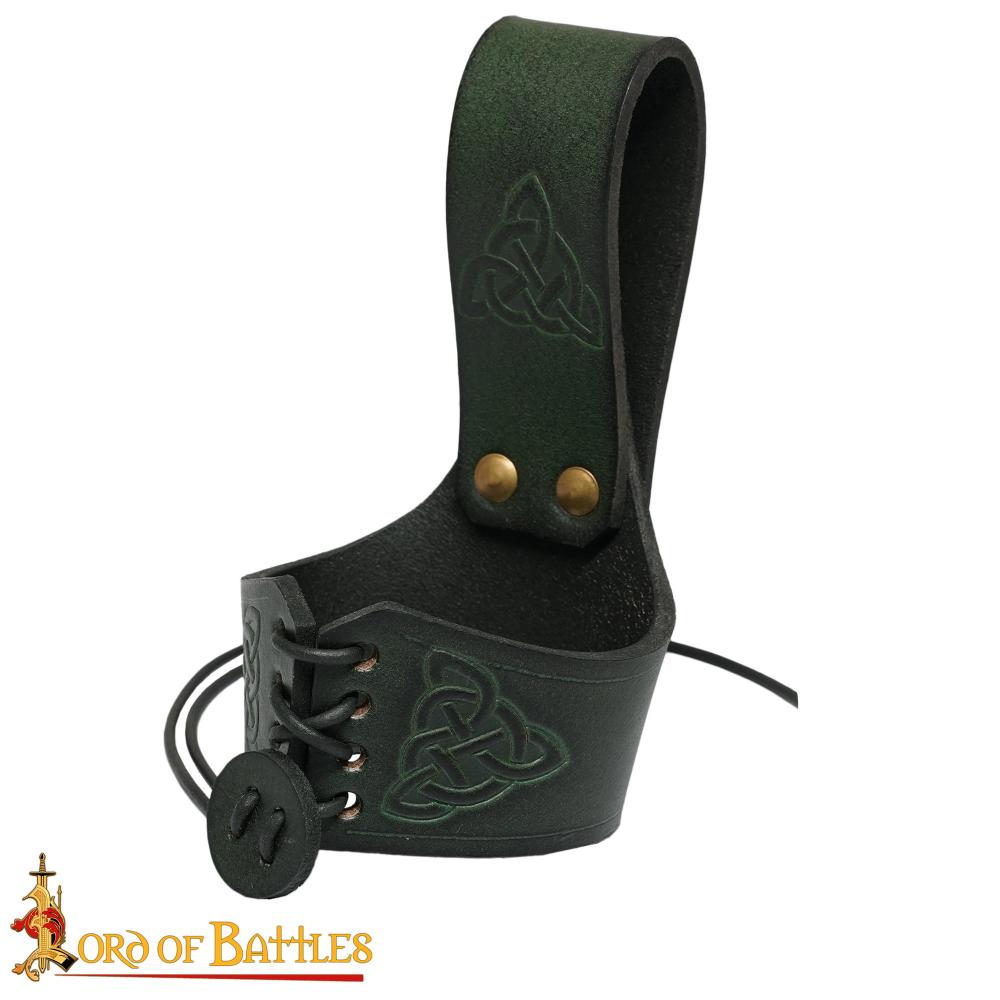 Green Leather Drinking Horn Holder with Embossed Design – Smaller Version – Lord of Battles