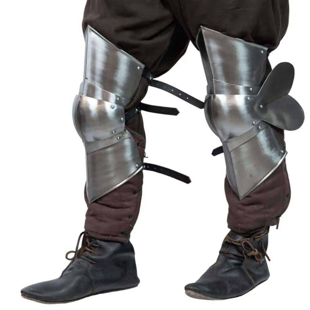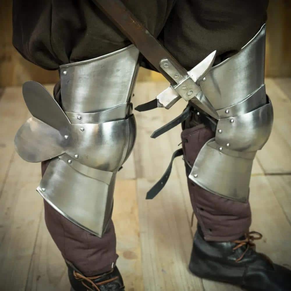Step into the realm of the Late Medieval Mercenary Poleyns with our expertly crafted steel knee armor, specifically designed for history enthusiasts and modern-day reenactors alike. These poleyns are a testament to the turbulent times of the Middle Ages, showcasing practical, affordable protection for archers, billmen, and spearmen. Crafted from robust 16-gauge mild steel, with the option for a lighter 18-gauge, they provide the perfect blend of durability and agility. Imagine gliding through a reenactment battlefield, assured that your knees are protected without the burden of weight weighing you down.