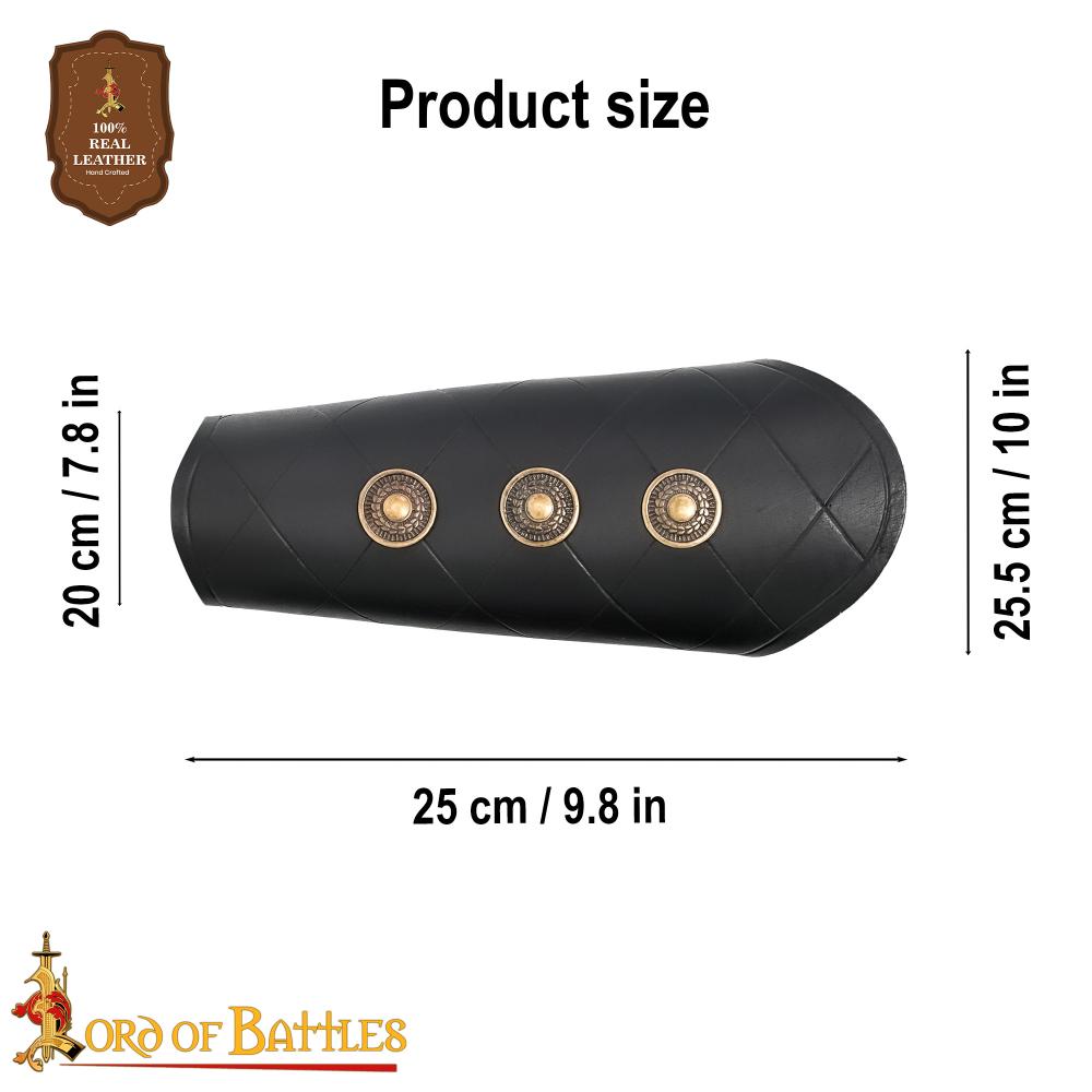 Painstakingly handcrafted from robust genuine buff leather, these bracers offer longevity and are hard-wearing. To fit a wide range of sizes, these bracers come with a set of adjustable leather strings. Each bracer has a length of approx. 25 cm, upper width of approx. 25.5 cm, and lower width of approx. 20 cm.