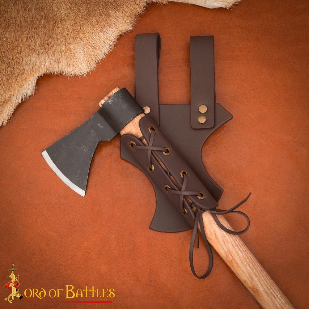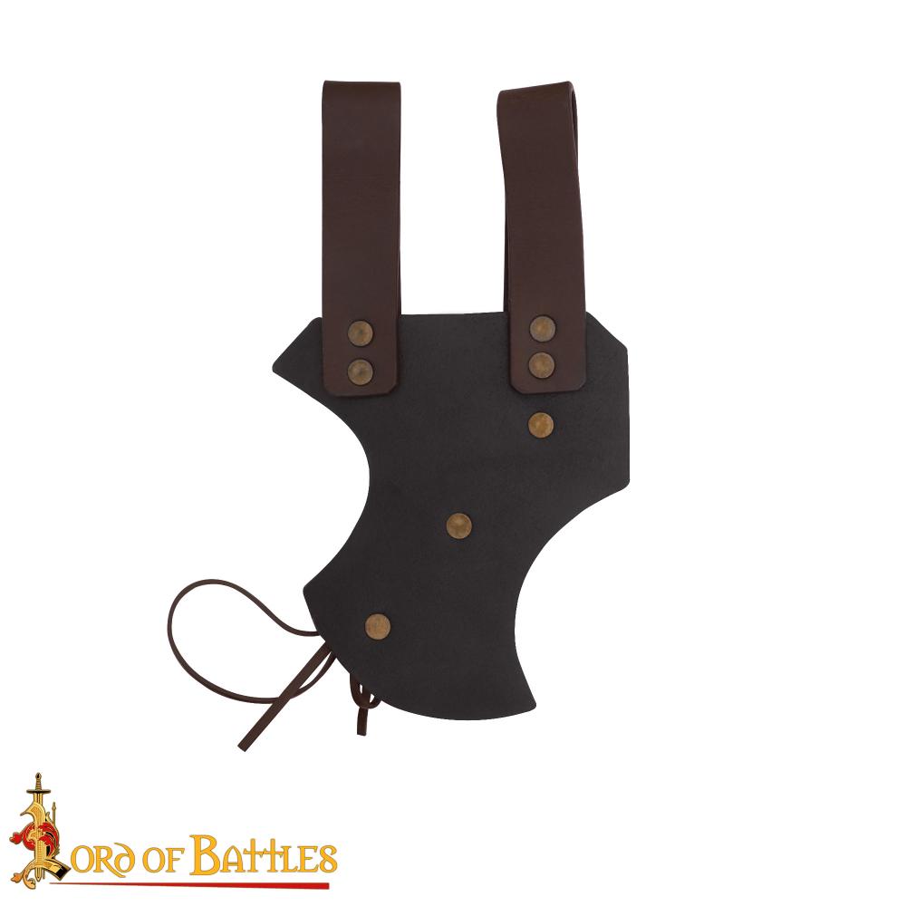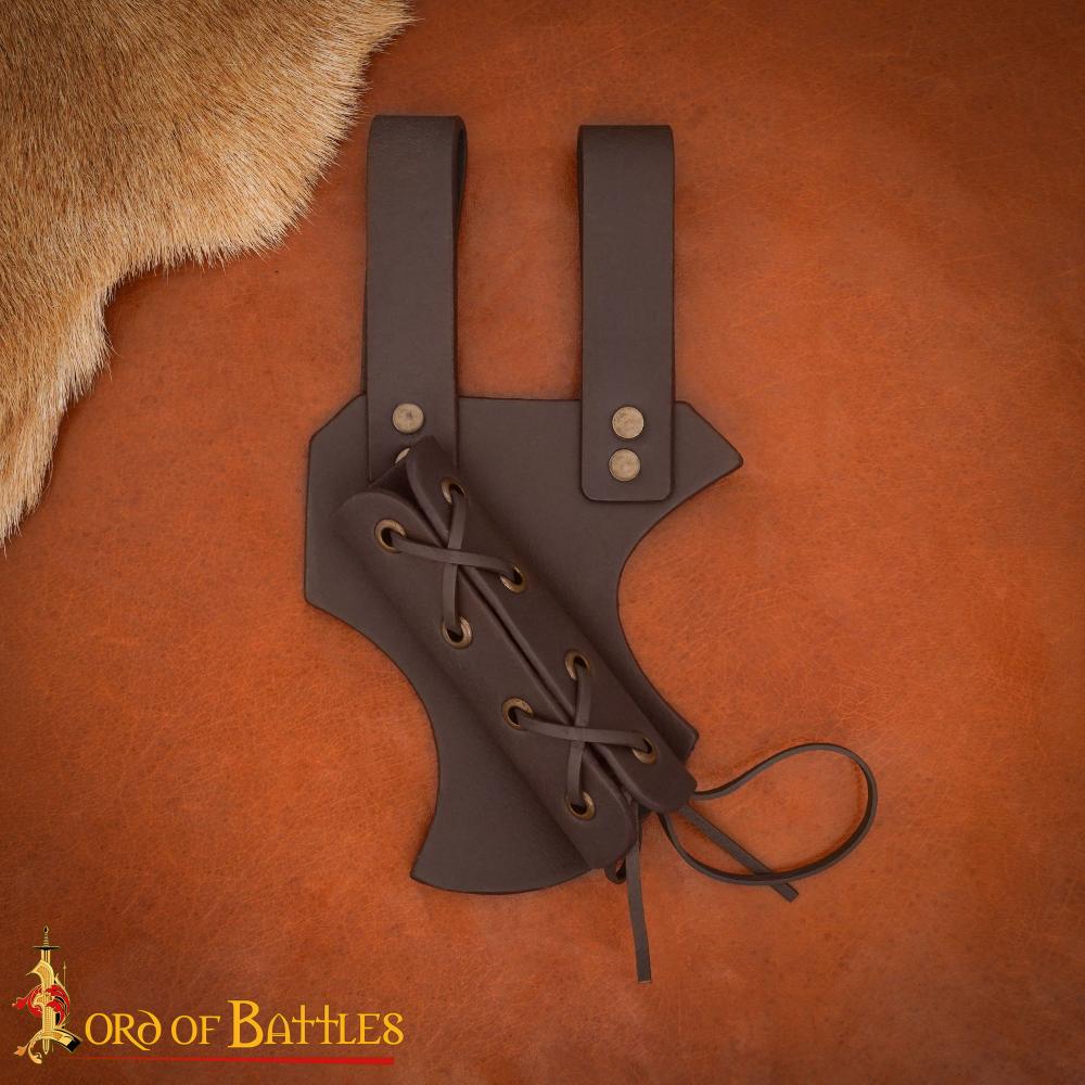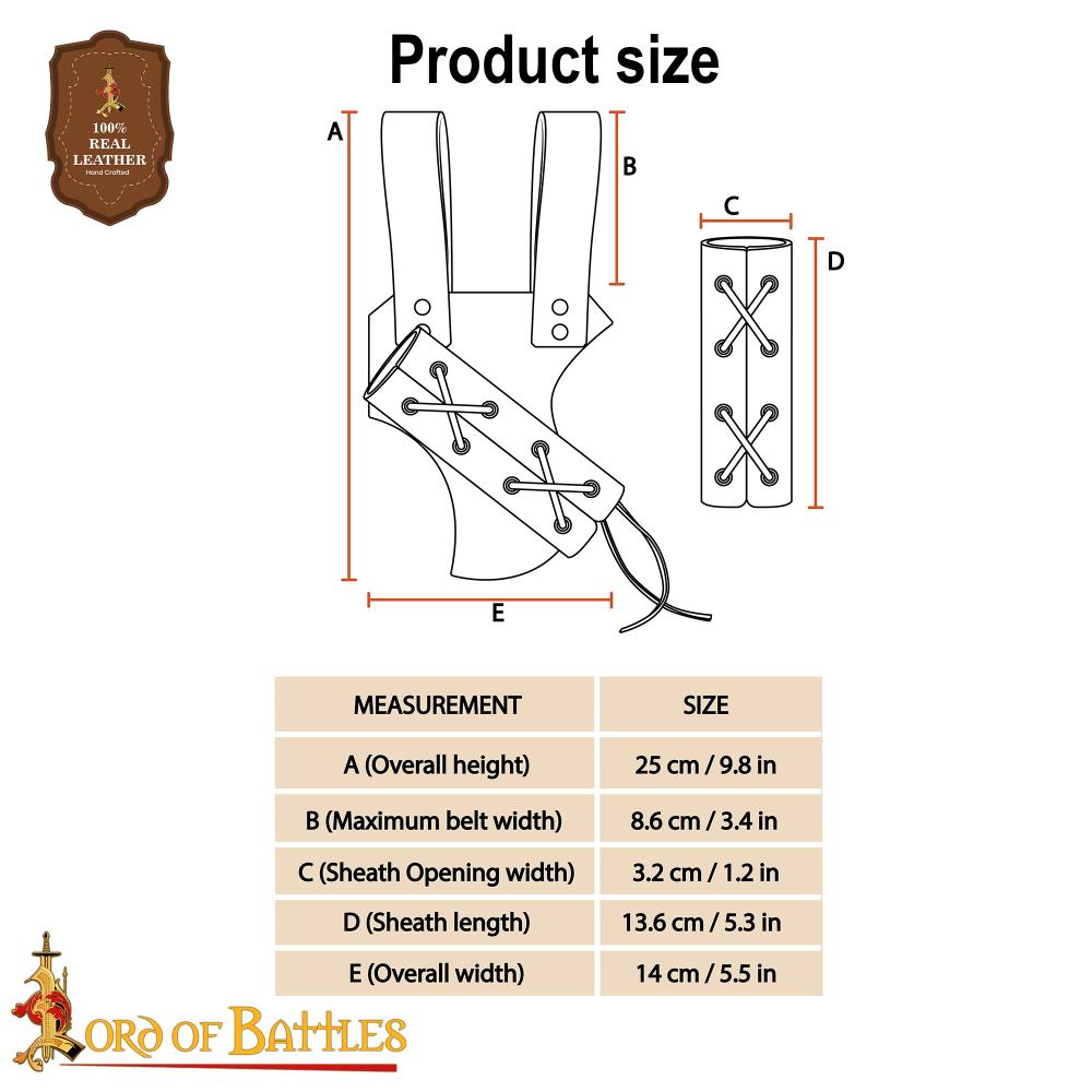 It is meticulously handmade from sturdy TOP GRAIN LEATHER. The holder has adjustable strings for variable weapon widths (for different swords and axes). The loops are attached to the frog with antique brass rivets that can easily fit a belt of width 10cm. Its dimensions are approx. (25 X 14) cm.