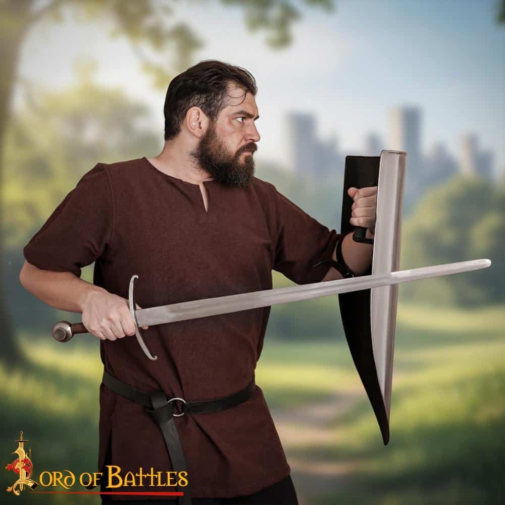 Function meets form with adjustable leather straps that offer a secure grip while you’re working on your masterpiece. The shield features a reinforced metal handle with wood elements, providing an ergonomic hold designed with comfort in mind. It’s worth noting that this shield is intended for right-handed users who carry it in their left hand, ensuring an intuitive and natural grip during handling. This design consideration not only adds to the authenticity of the shield but also enhances your overall experience as you engage with this historic item.