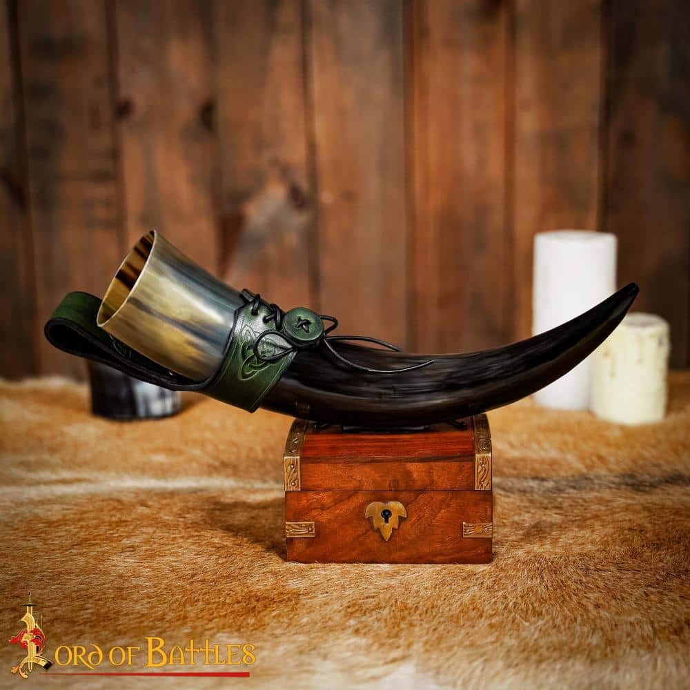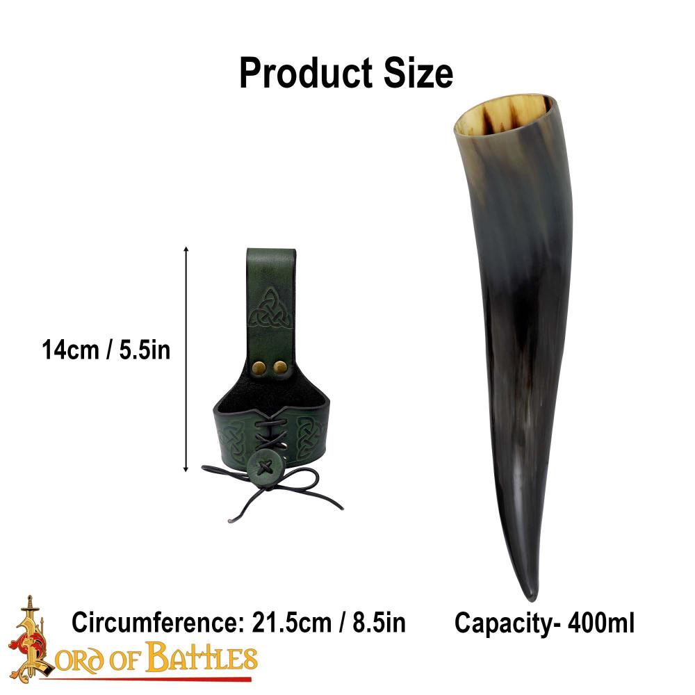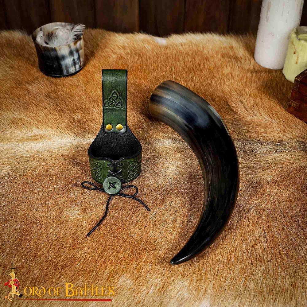 Viking Drinking Horn with Green Leather Holder and Bag – 400 ml – Lord of Battles
