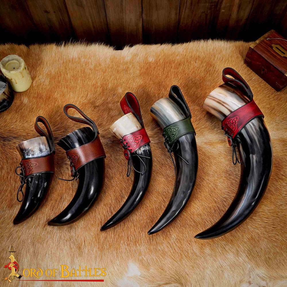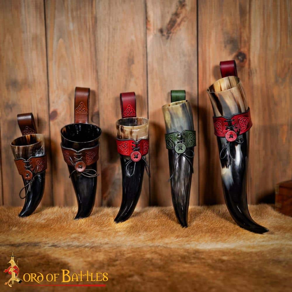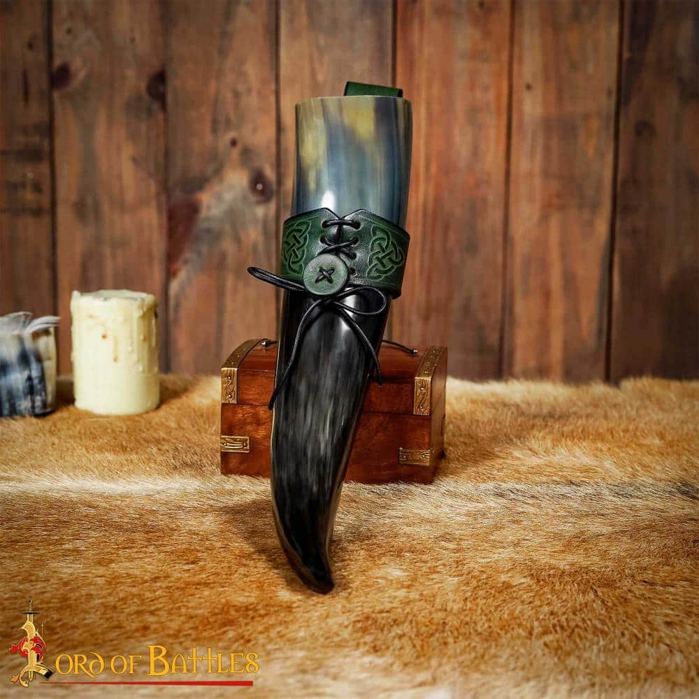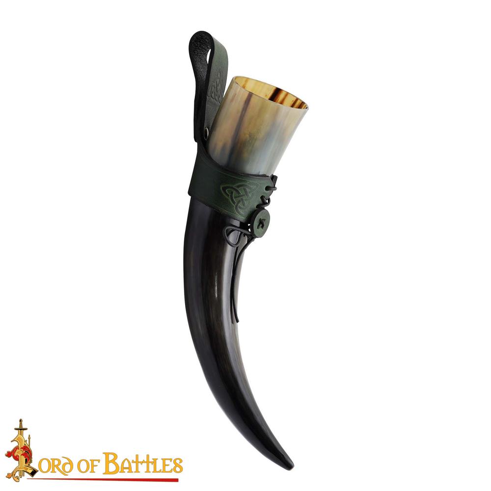 Viking Drinking Horn with Green Leather Holder and Bag – 400 ml – Lord of Battles