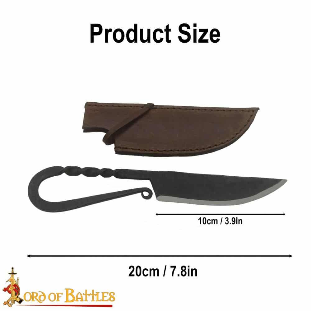 Painstakingly hand forged from tough iron it is hard-wearing hence offering longevity. The protective leather sheath is made from genuine and robust buff leather that can hang around the neck with an adjustable leather cord. Its total length is approx. 20 cm (7.8 inches) with an approx. blade length of approx. 10 cm (3.9 inches).