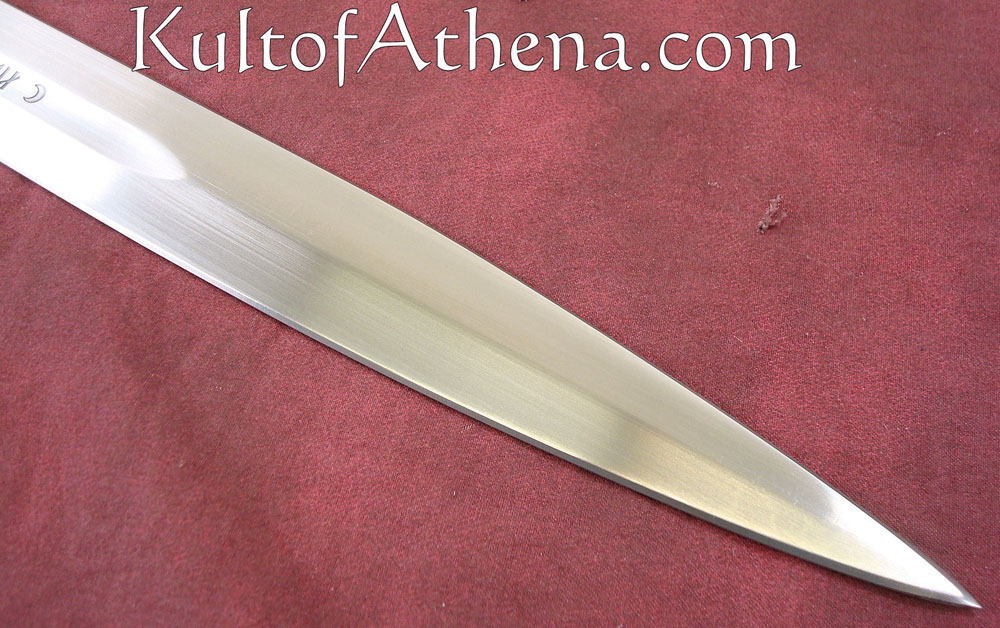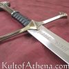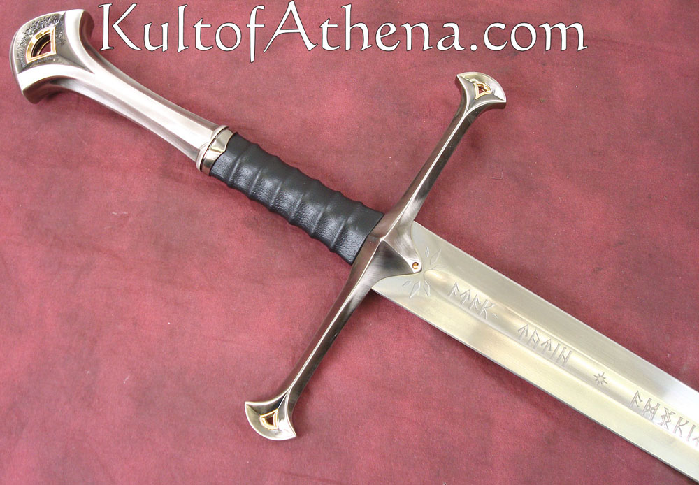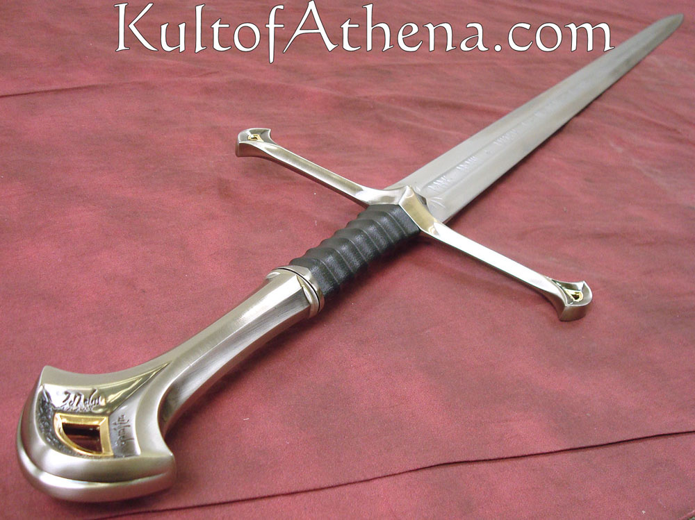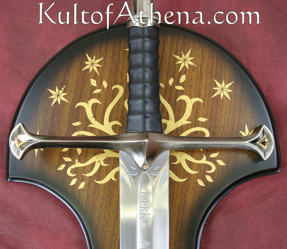 Officially licensed Lord Of The Rings movie replica. Features Solid metal crossguard and pommel with an antique silver plated finish and twenty-four karat gold plated fittings. The pommel is inscribed with runes and the grip is wrapped in genuine leather. The blade is 420 J2 stainless steel with deep etched runes. Wood wall display plaque included.