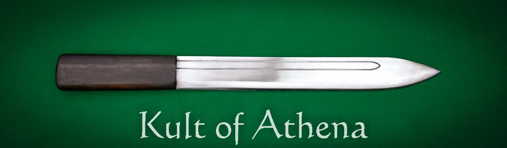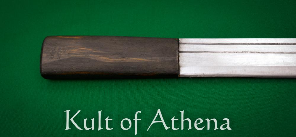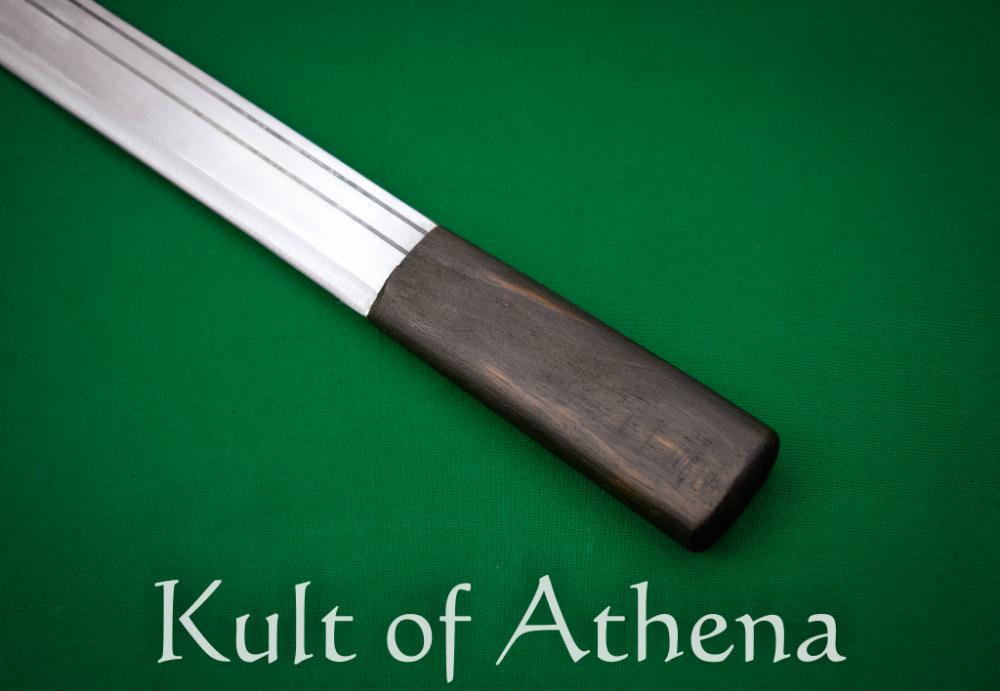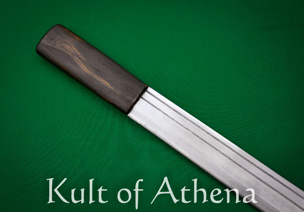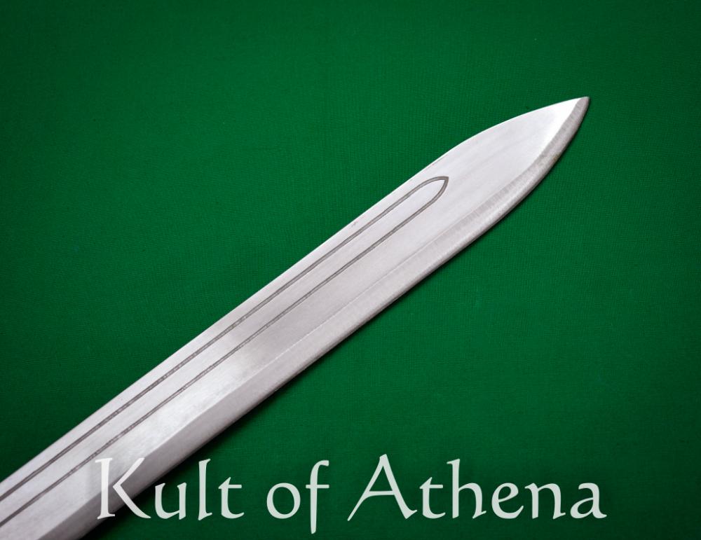 This light broad seax is reminiscent of weapons that have been found in archaeological digs from Paris to Trondheim. Blades like this were used by the Merovingians/Carolingians and other Iron age/ Viking age cultures. It could have been purchased at a trade center or obtained at no cost as a battlefield pick-up. These blades are very robust with both the edge and the back of the blade curving towards the tip, which is generally located at the centerline of the blade. Many examples have two decorative grooves that meet toward the tip of the blade. Some examples like this one have a heavy broad blade that is designed to defeat mail shirts. This was accomplished by thrusting it into an opponent and forcing apart and breaking the riveted links so that the blade could pass through.
