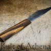 This robust bladed seax is the so-called broken-back style seax. These seaxes have a sharp angled transition between the back section of the blade and the point. This shape makes the spine appear to be broken like a beast with a broken back which is where this evocative blade style gets its name. Knives or Seaxes such as these were common in Viking age Britain and Ireland, although some examples have been found in archaeological digs in Germany and have been dated around 8th-11th century. Knives like these were used every day just as the smaller knives were, however, they were substantial enough to have proven useful if your main weapon was lost during combat or during an unexpected mead hall brawl as well.