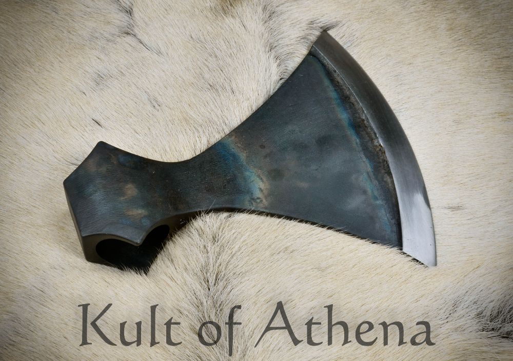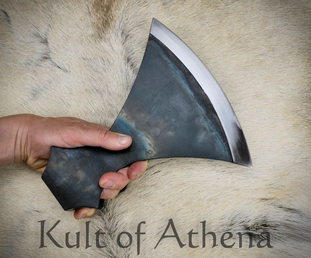 We used several historical examples when deciding the shape and weight of our Dane axe (Petersen Type M) and based it on some of the larger examples found. It has a reinforced cutting edge, which adds weight but also durability; it can be ground down and resharpened to reduce weight.