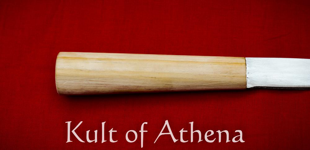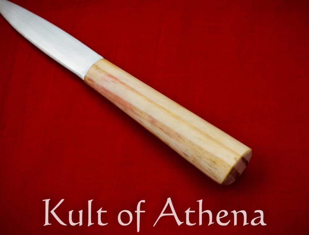 Designed by Markland Merchants to be a historically accurate utility knife for the serious Viking reenactor, this Viking utility knife has a blade of tempered and sharpened EN45 high carbon steel with an HRc hardness of 56-58 HRc. The grip is Poplar wood which has been intentionally left unfinished so that the reenactor can oil, stain, carve or modify the grip as desired. The Poplar wood is ideal for detailed carving which makes this knife an ideal project knife for you to customize to your own liking. The blade tang is durably secured into the hilt and the length of the tang runs about half the length of the grip. Included with the knife is a durable leather sheath of high quality vegetable-tanned leather with stitched construction. The sheath is left undyed so that it can be oiled or dyed to your preference for a custom finish.