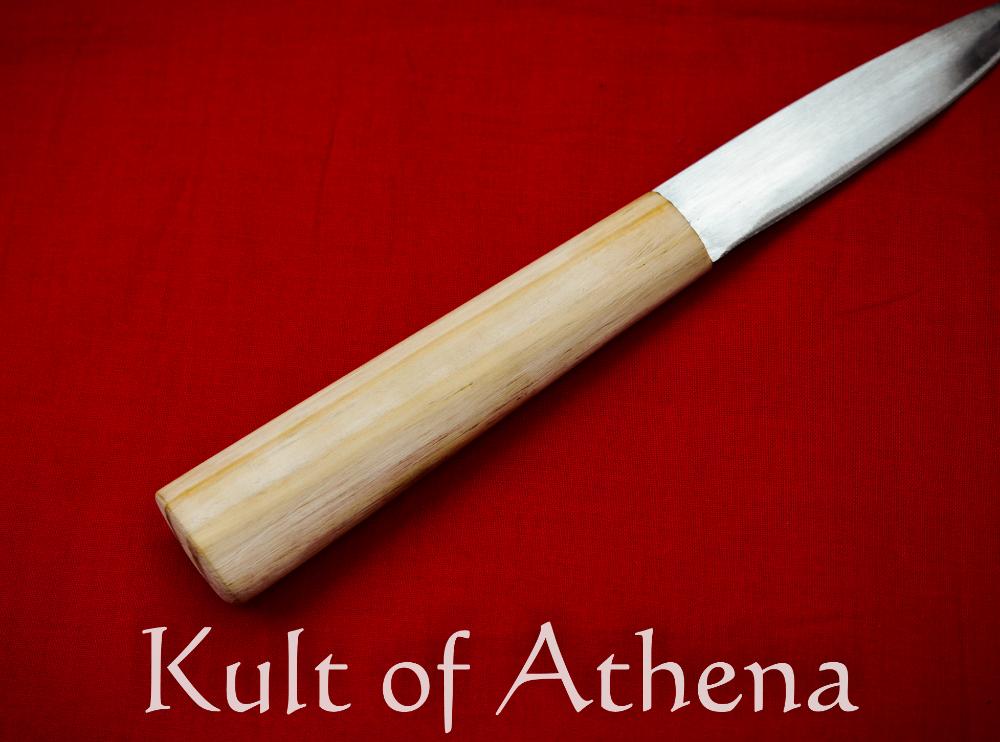 This small Viking age knife or seax replica is crafted in a configuration that we decided upon after long hours of research. It is very much like many of the knives that reside in museums throughout Europe and Scandinavia. Examples of this type of knife would have been found all over Viking age Scandinavia, Europe, and the Eastern-Rus territories as far as Novgorod. It is not an exact example of one particular knife, it is an amalgamation of many knives of the same shape and size. Knives like these were used every day for carving wood, peeling fruit, cutting rope, or trimming meat. It was the utilitarian belt knife of the period and as such would have been readily available in large trade centers such as Haithabu/Hedeby, Jorvik, and Birka.