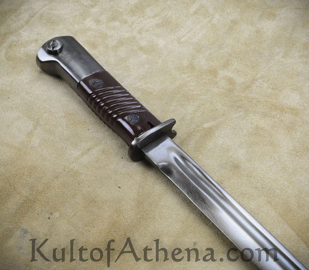 blade isn’t straight with the tang and the handle scales are off, leaving a gap near the tang of the blade. however the bright side is it does fit onto a vz.24 and a K98, have yet to try it on a g98 but am fairly certain it will work. beyond the complaints of the handle it is a fairly decent replica for the price. the spring lock on mine had no slot but is a minor issue and still functions to lock onto the bayonet mount. needed a little filing for a better fit.