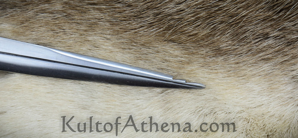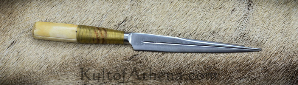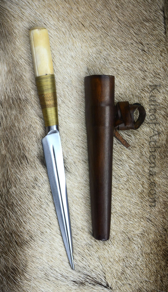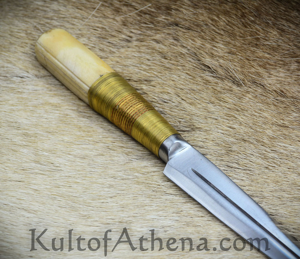 This Medieval Knife has a blade forged from high carbon steel. The grip is carved from bone and finished with a half-wrap of brass wire with twisted copper wire inlay. The scabbard is crafted from wood which is overlaid in leather with a blackened metal hanging ring.