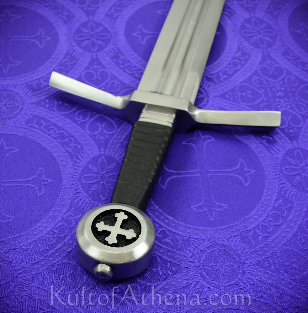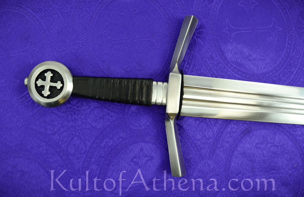 This Medieval Cruciform Pommel Sword has a blade forged of EN45 high carbon steel. The crossguard is of steel and the wooden grip is bound in black leather. The recessed pommel prominently features a Budded Cross on both sides. Atop the guard is a felt tab to cushion to guard from the scabbard – it can be removed if desired.