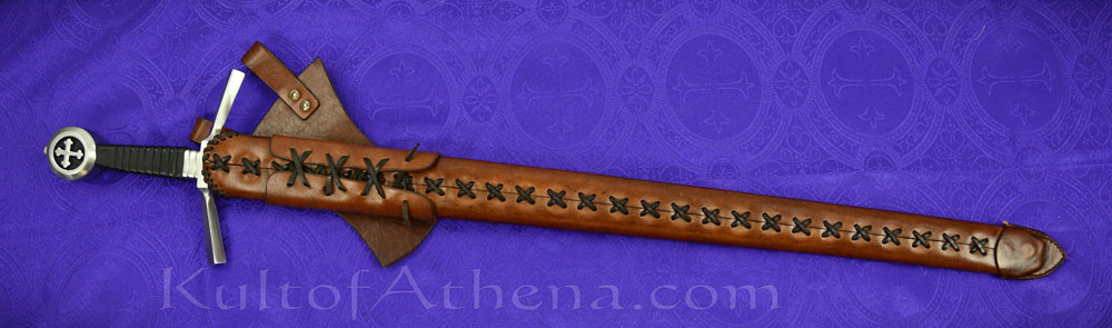 The scabbard is of robust leather and is constructed with thick, stitched leather cord; included is a riveted and stitched leather frog with belt loops which can be removed if desired, or used to wear the sword with a sword belt.