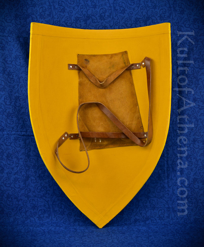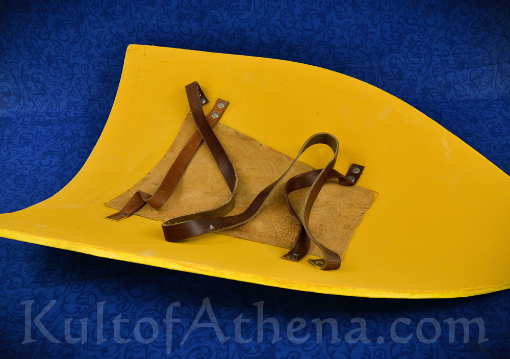 The back of the shield has a set of riveted leather straps for the arm, as well as a longer strap for wearing over the shoulder. The shield is finished with a cushion of padded leather to give the shield a degree of shock resistance to the arm behind the shield.