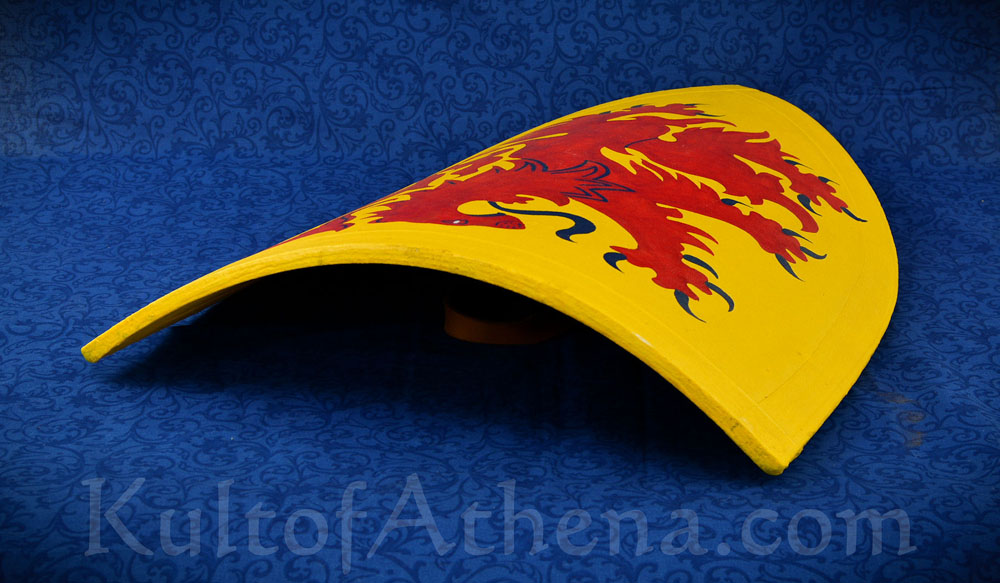 This Heater Shield is hand painted with a red lion over a yellow field. The shield was constructed from poplar wood and bound in linen before being painted.