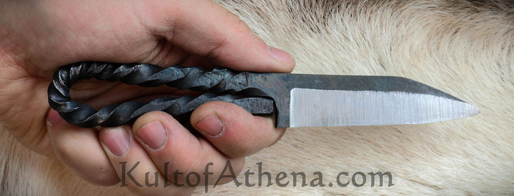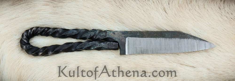 This Medieval Hunting Knife is hand forged from high carbon steel; the long tang was twisted and folded back on itself to form a simple and durable, period-appropriate handle. This knife can function not only as hunting knife, but will also serve well as a medieval utility knife for chores and work.