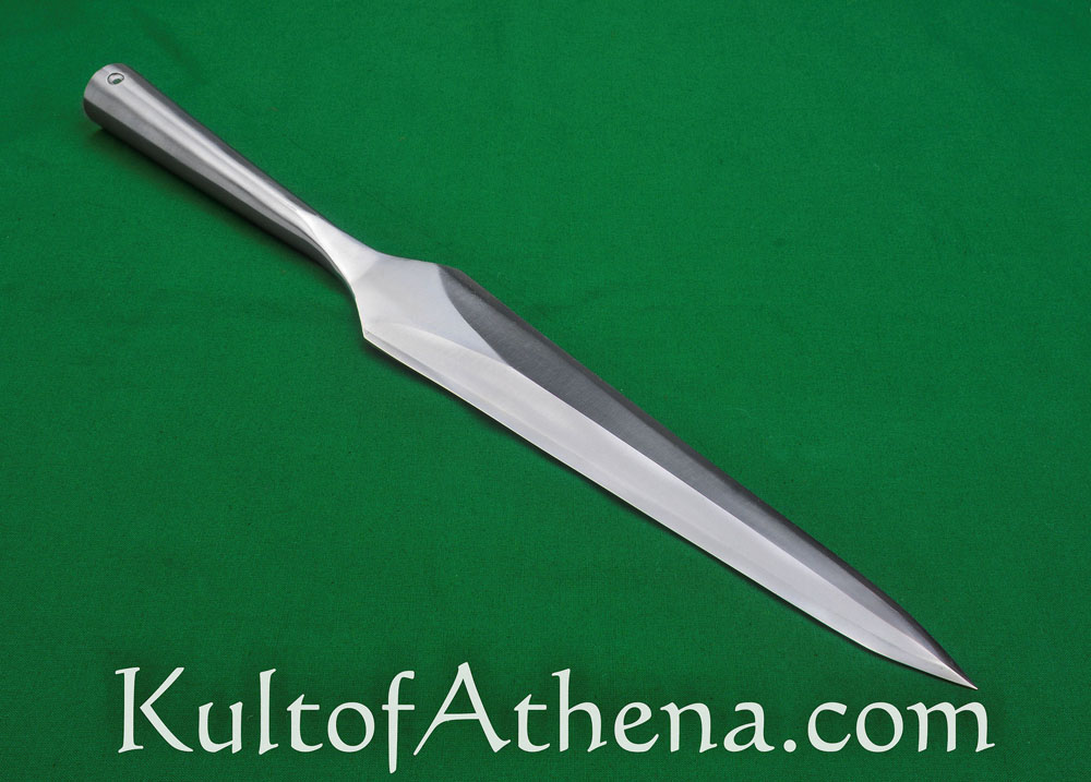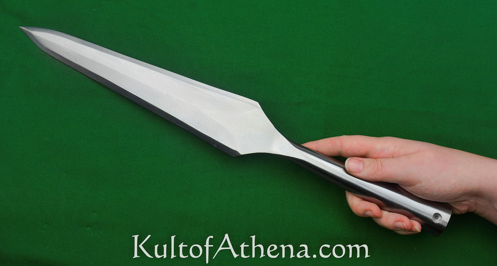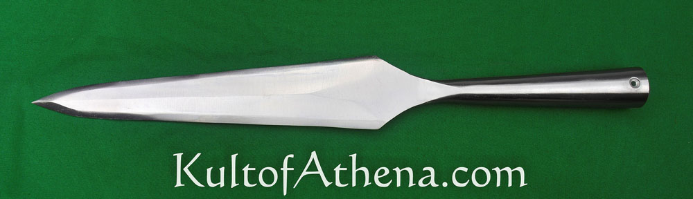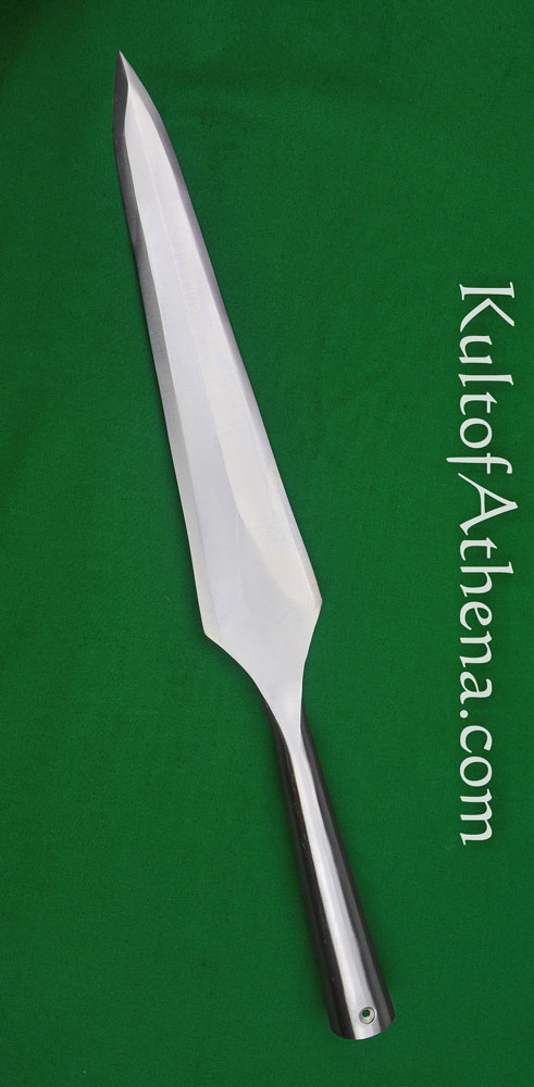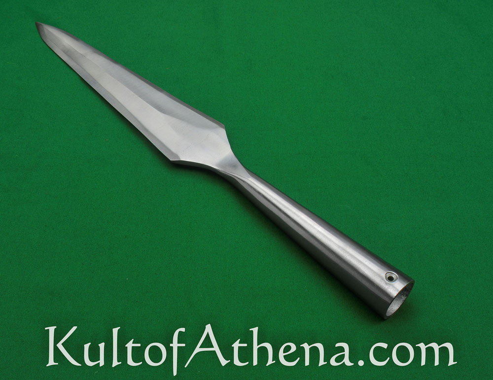 This robust spearhead has a thick and broad base to give it durability and this tapers into a blade form with a prominent central ridge. This diamond-shaped cross section to the spearhead blade gives it increased rigidity and stiffness to ensure that minimal energy is lost to blade flex in a strike. The spearhead is hand-forged from steel it has a socket diameter of approximately 1 (26 mm). The base of the spearhead has pre-drilled holes for screws or pins which can be used to secure the head the haft. This additional mounting hardware is not included.